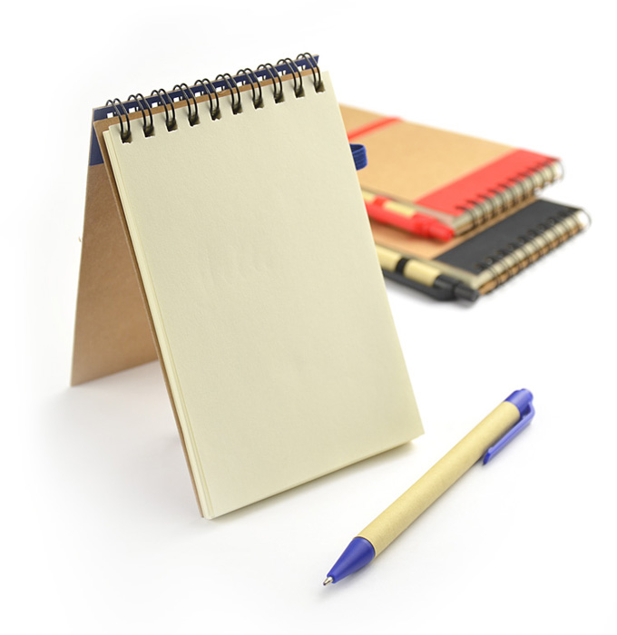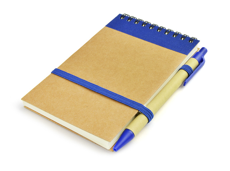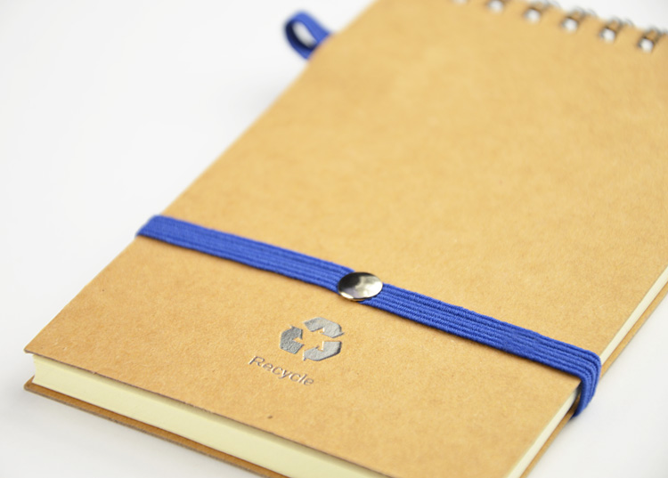 Agenda notes personalizata realizata din materiale reciclate. Produsul include pix si cuprinde 70 de pagini veline. Coperta este realizata din carton si este decorata in partea superioara cu o banda contrastanta. Agenda este legata cu spirala in partea superioara si este prevazuta cu un elastic in nuanta contrastanta pentru inchidere, pozitionat in partea centrala. In partea dreapta sus prezinta un suport elastic pentru pix. Culori: Negru, Albastru, Rosu. Dimensiuni: 143 x 100 x 13 mm. Agenda se poate personaliza prin timbru sec, serigrafie sau print UV. Costurile de personalizare se calculeaza separat in functie de specificatiile clientului. Comanda minima: 50 buc. Pretul nu contine TVA.