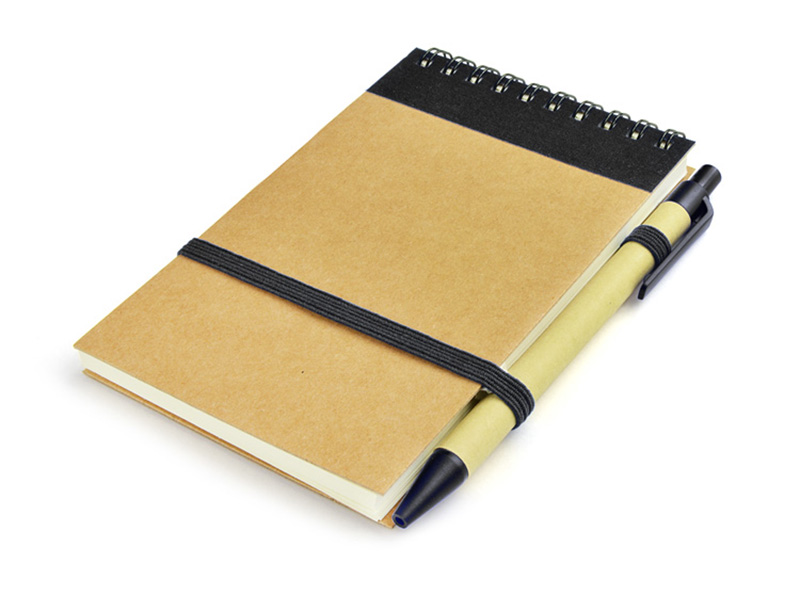 Agenda notes personalizata realizata din materiale reciclate. Produsul include pix si cuprinde 70 de pagini veline. Coperta este realizata din carton si este decorata in partea superioara cu o banda contrastanta. Agenda este legata cu spirala in partea superioara si este prevazuta cu un elastic in nuanta contrastanta pentru inchidere, pozitionat in partea centrala. In partea dreapta sus prezinta un suport elastic pentru pix. Culori: Negru, Albastru, Rosu. Dimensiuni: 143 x 100 x 13 mm. Agenda se poate personaliza prin timbru sec, serigrafie sau print UV. Costurile de personalizare se calculeaza separat in functie de specificatiile clientului. Comanda minima: 50 buc. Pretul nu contine TVA.