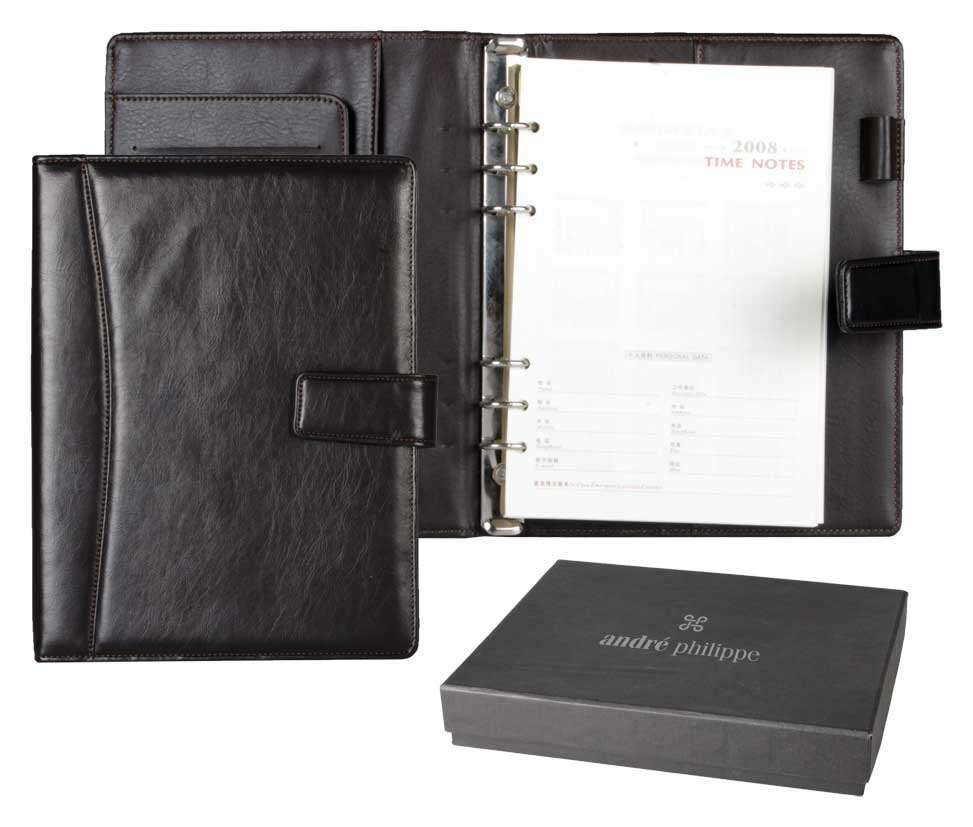 Agenda personalizata datata format A5, brand Andre Philippe. Coperta din imitatie piele si inchidere cu clapa. La interior prezinta mai multe compartimente pentru carduri sau carti de vizita si suport pentri instrument de scris. Blocul de carte este prins cu spirala si contine sectiune pentru contacte si adrese. Agenda se livreaza in cutie cadou de carton neagru. Culoare: maro inchis. Dimensiuni: 185 x 235 mm.Va recomandam sa personalizati agenda prin timbru sec , folio, serigrafie, file de insert sau productie speciala. Costurile de personalizare se calculeaza separat in functie de specificatiile clientului.Cantitate minima 50 buc. Pretul nu contine TVA.