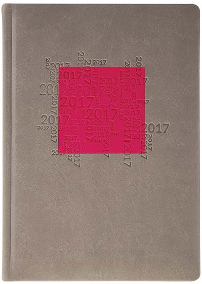 Agenda imprimata datata format A5 cu 384 de pagini offset de culoare alba. Agenda este printata la interior cu culoarea gri. Interiorul este organizat sub forma de calendar zilnic iar in partea de sus a fiecarei pagini sunt inscrise luna si ziua. Caledarul este sincronizat pentru anii 2016, 2017 si 2018. Informatiile cuprinse sunt traduse in cinci limbi: Engleza, Germana, Rusa, Italiana si Franceza. Sarbatorile internationale sunt semnalizate corespunzator datelor oficiale. Produsul cuprinde sectiuni pentru datele personale si pentru adrese/numere de telefon. Blocul de carte are colturile perforate. Coperta este realizata din piele ecologica. Inscriptia anului calendaristic are un design modern si este pozitionata central intr-un patrat de material in nuanta contrastanta. Pretul afisat include aplicarea timbrului sec cu anul calendaristic de pe coperta. Se recomanda personalizare agenda prin timbru sec, folio, serigrafie, file de insert sau productie speciala. Costurile de personalizare se calculeaza separat in functie de detaliile/specificatiile clientului. Culori: Gri/Roz, Maro/Crem, Portocaliu/Bleumarin, Negru/Rosu, Bleu/Bleumarin. Dimensiuni: 143 x 203 mm. Comanda minima: 500 buc. Pretul nu contine TVA.