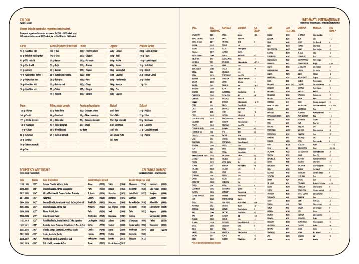 Agenda personalizata nedatata format A5 cu 360 de pagini dictando de culoare ivoire (offset 70g/m2). Agenda este cusuta, legata si cuprinde: 352 pagini imprimate in doua culori, bronz si negru, si 8 pagini atlas policromie. Forzatul este de culoare ivoire iar banda de capital este crem. Coperta este realizata din poliuretan, este flexibila si cusuta perimetral. Inchiderea se realizeaza cu un elastic asortat cromatic cu coperta. Coperta cu colturi rotunjite si bloc cu colturi rotunjite si perforate. Semnul de carte este de culoare bronz. Se recomanda personalizarea copertii cu timbru sec iar la interior 2 – 4 pagini. Costurile de personalizare se calculeaza separat in functie de detaliile/specificatiile dorite de client. Culori: Bleumarin, Maro, Rosu. Dimensiuni: 14 x 20.5 cm. Comanda minima: 50 buc. Pretul nu contine TVA.