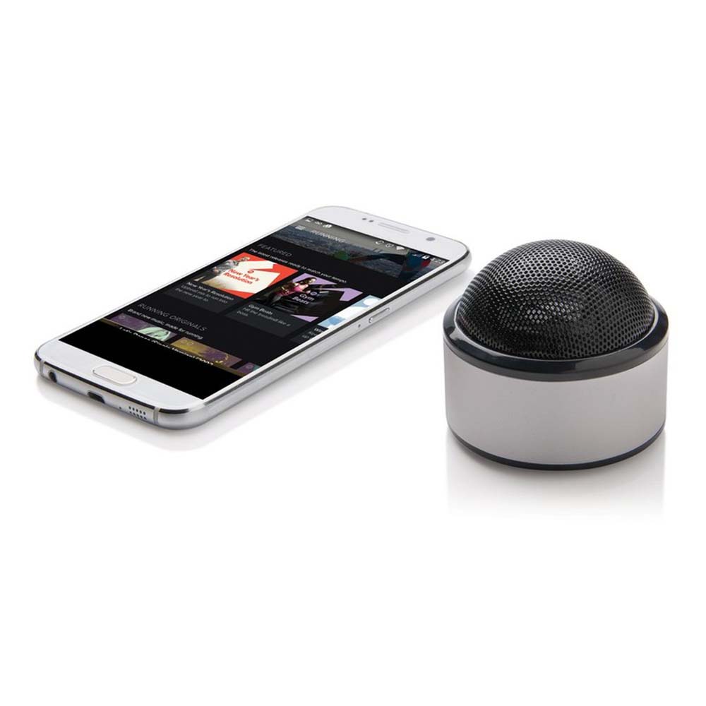Boxa portabila personalizata cu conectare prin bluetooth si design modern. Are o putere de 3W si este echipata cu o baterie de 350 mAh care va permite sa ascultati muzica preferata oriunde. Sistemul de conectare prin bluetooth va permite pozitionarea boxei personalizate la o distanta maxima de 10 metri fata de dispozitivul mobil la care este conectata. Aceasta boxa portabila personalizata este un produs care va poate asigura ambientul muzical din timpul petrecerilor in aer liber, la picnicuri, in calatorii sau drumetii. Este compatibila cu orice telefon mobil si se livreaza cu cablu USB inclus in pret. Produs confectionat din metal. Culori: verde, albastru, negru, alb, argintiu. Dimensiuni: 6 x 5 x 5 cm. Va recomandam personalizarea prin serigrafie. Costurile de personalizare se calculeaza separat in functie de siglele sau textele solicitate. Comanda minima 50 buc.
