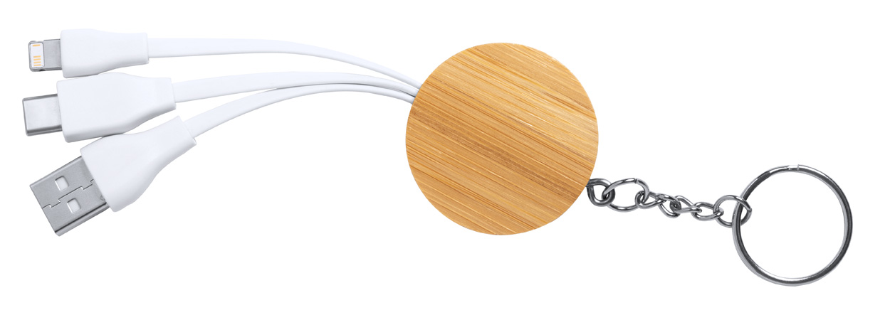 Breloc din bambus echipat cu 3 tipuri de cabluri de incarcare: mirco USB, USB-C si Lightning. Dimensiune produs 40x180x15mm. Culori disponibile: maro. Pretul afisat nu include costurile de personalizare. Acestea se calculeaza la cerere in functie de specificatiile proiectului dvs. Comanda minima: 50 buc. Pretul nu include TVA