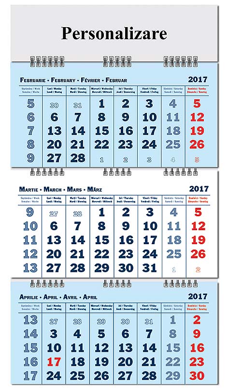 Calendar personalizat triptic pentru perete. Produs este pliabil si este format din 3 seturi de 12 file legate individual cu spira metalica dubla de culoare alba. Calendarul este realizat din hartie offset (80 g/m2). Spatele calendarului este realizat din carton duplex (300 g/m2). Personalizarea se realizeaza pe capac in 1 – 4 culori iar formatul maxim imprimat este de 40 x 15 cm. Costurile de personalizare se calculeaza separat in functie de detaliile/specificatiile dorite de client. Dimensiuni: 40 x 60 cm. Comanda minima: 50 buc. Pretul nu contine TVA.