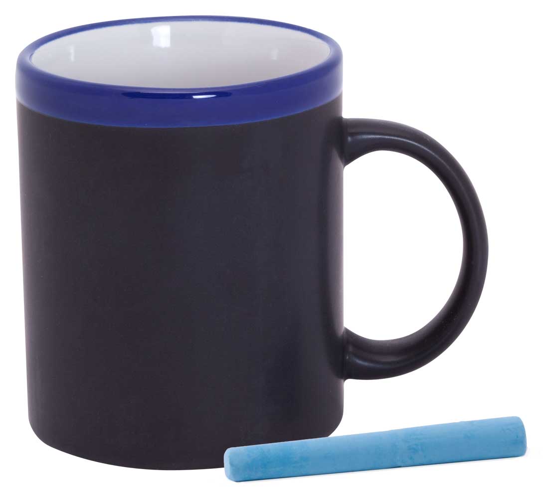 Cana personalizata ceramica cu suprafata exterioara colorabila cu creta. Produs de culoare neagra cu o banda colorata in partea superioara a produsului. Se livreaza ambalata in cutie individuala si include o bucata creta asortata cu banda colorata de pe Cana personalizata. Culori: rosu, albastru, galben, alb. Dimensiuni: diametru 80 x 96 mm. Se recomanda personalizare cana cu creta prin tampografie. Costurile pentru acest serviciu se calculeaza separat in functie de cerintele clientului.Cantitate minima 50 buc. Pretul nu contine TVA.