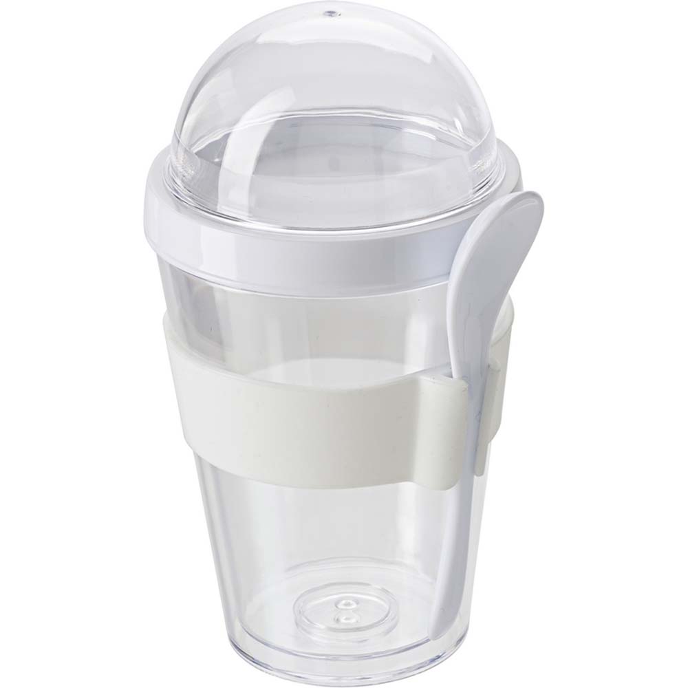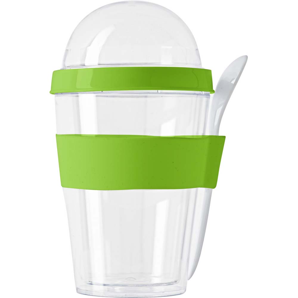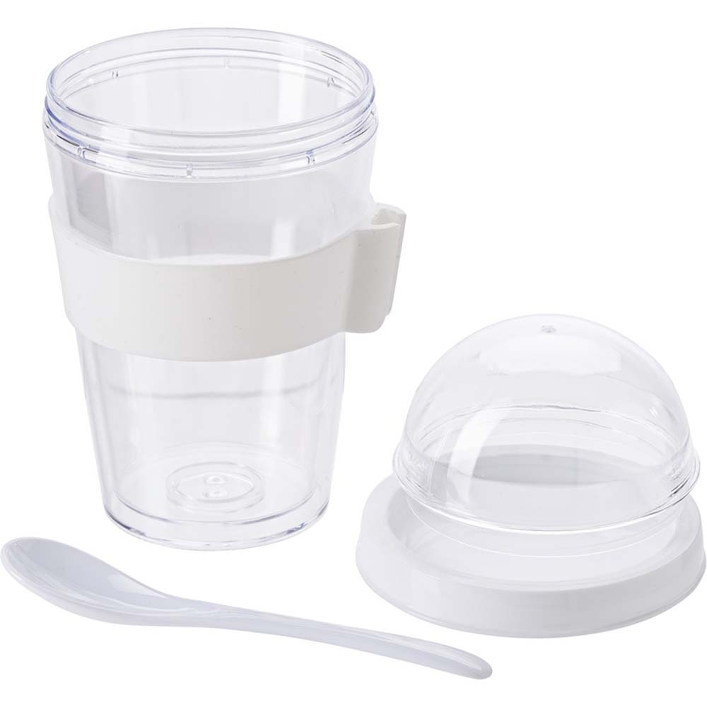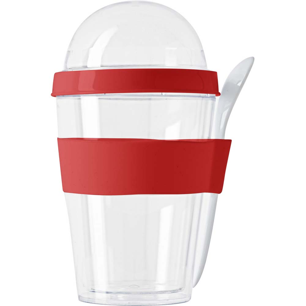 Caserola personalizata de tip cana potrivita pentru supe, smoothie sau lapte. In partea superioara este prevazuta cu un compartiment mai mic potrivit pentru crutoane sau cereale. Este decorata cu doua inele din cauciuc, unul dintre ele cu rol de suport pentru lingura inclusa in set. Este un produs potrivit pentru gustarile din timpul calatoriilor sau pentru transportul alimentelor la serviciu. Este ideal pentru alimentele sau mancarurile lichide. Este un obiect promotional util care va avea succes in campaniile de promovare de produse alimentare. Produs confectionat din plastic si cauciuc. Culori: transparent/alb, transparent/rosu, transparent/verde, transparent/albastru. Dimensiuni: diametru 9 x 16.2 cm. Va recomandam personalizare caserola prin serigrafie. Costurile de personalizare se calculeaza separat in functie de specificatiile proiectului dvs. Comanda minima 50 buc.