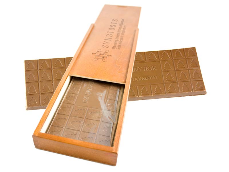 Tableta de ciocolata personalizata cu suprafata embosata cu motive/sigle/logo-uri la alegerea clientului. Tableta este fabricata din ciocolata belgiana de foarte buna calitate, este ambalata in folie transparenta si este dispusa intr-o cutie eleganta din lemn. Tableta are dimensiuni mari fiind formata din 42 de cuburi si o zona centrala generoasa dedicata personalizarii (5.4 x 20 cm). Fie ca vorbim de evenimente, de cadouri personalizate, de cadouri corporate, de campanii de promovare pentru produse sau de produse promotionale pentru compania ta, ciocolata este alegerea potrivita in oricare dintre situatii. Dimensiuni ciocolata: 25.8 x 8.5 x 1 cm. Gramaj: 250g. Dimensiuni cutie: 30 x 10.3 x 2.7 cm. Termen de valabilitate: 6 luni. Pretul include costurile pentru personalizarea produsului prin gravarea cutiei si embosarea tabletei de ciocolata. Comanda minima: 100 buc.