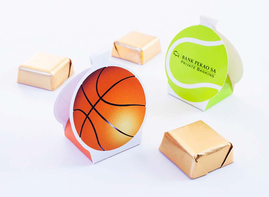 Ciocolata personalizata ambalata individual in folie laminata aurie si dispusa in cutii din carton cu design special. Bomboana este fabricata din ciocolata de calitate superioara si este dispusa la interiorul unei cutii de carton cu laturi rotunde care imprimate cu design cu tematica sportiva: minge fortbal, minge tenis, minge volei, minge baschet, etc. Ciocolata personalizata este un produs iubit de majoritatea persoanelor si va fi un produs promotional cu care nu vei da gres la evenimente tematice, cadouri personalizate, cadouri corporate sau in campaniile de marketing ale companiei tale. Gramaj: 17g. Dimensiuni cutie: 6 x 5.5 x 3.6 cm. Termen de valabilitate: 6 luni. Pretul include personalizarea produsului prin imprimare digitala. Comanda minima: 250 buc.