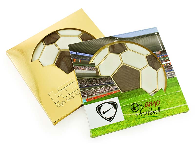 Ciocolata personalizata ambalata individual in cutie personalizata cu design deosebit. Tableta de ciocolata este fabricata din ciocolata belgiana de calitate in doua culori. Combinatia de ciocolata cu lapte si ciocolata alba confera produsului un plus de savoare iar designul deosebit transforma acest produs intr-unul original. Tableta este compusa din 16 piese dispuse pe un suport special argintiu sau auriu iar impreuna formeaza o minge de fotbal. Este protejata de o folie transparenta si este dispusa la interiorul unei cutii personalizate prevazuta cu fereastra care permite vizualizarea produsului. Ciocolata personalizata este un produs iubit de majoritatea persoanelor si va fi un produs promotional cu care nu vei da gres la evenimente tematice, competitii sportive, cadouri personalizate, cadouri corporate sau in campaniile de marketing ale companiei tale. Gramaj: 65g. Dimensiuni cutie: 14.7 x 14.3 x 1.1 cm. Dimensiuni ciocolata: diametru 12 x 0.8 cm. Termen de valabilitate: 6 luni. Pretul include personalizarea produsului prin imprimare digitala. Comanda minima: 200 buc.
