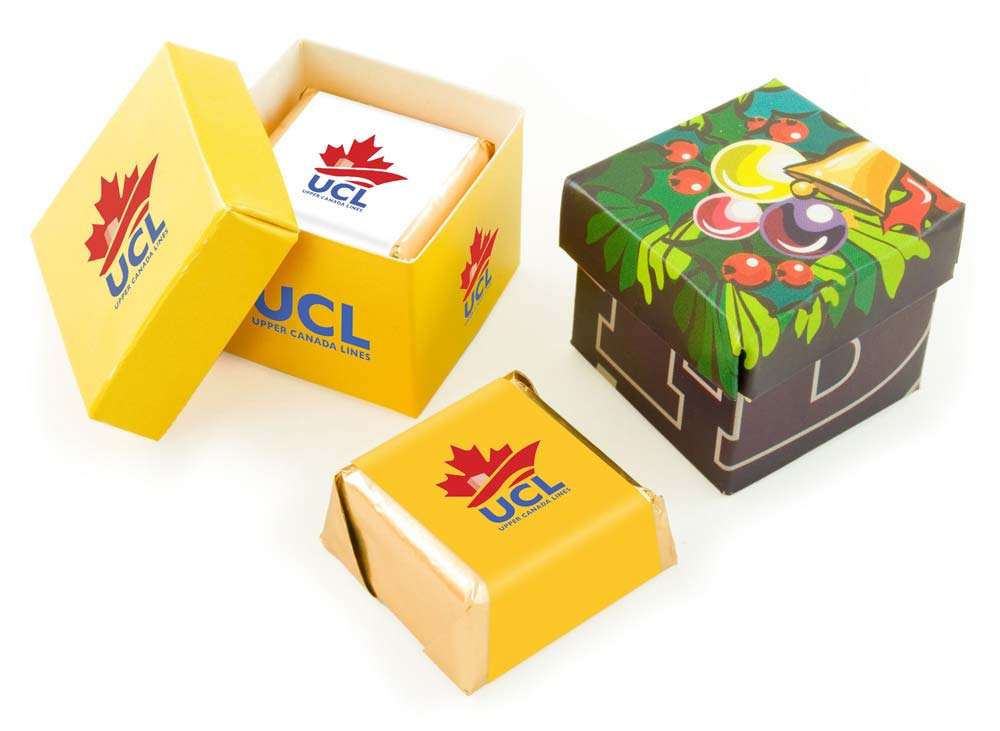 Ciocolata mini ambalata individual in cutiute moderne, de mici dimensiuni si care respecta designul cutiilor pentru cadouri. Este un produs fabricat din ciocolata cu lapte iar la interior prezinta o umplutura cremoasa cu adaos de alcool. Exista mai multe arome pentru umplutura printre care: fistic, ciocolata si malaga. Fiecare ciocolata personalizata este invelita in folie laminata aurie. Acest produs poate fi alegerea potrivita pentru un eveniment aniversar, o campanie de promovare a unui produs sau se poate transforma cu usurinta intr-un produs promotional pentru compania pe care o reprezinti. Dimensiuni cutie: 4 x 4 x 3.2 cm. Gramaj: 17g. Termen de valabilitate: 6 luni. Pretul include costurile pentru personalizarea produsului prin imprimare digitala. Comanda minima: 250 buc.