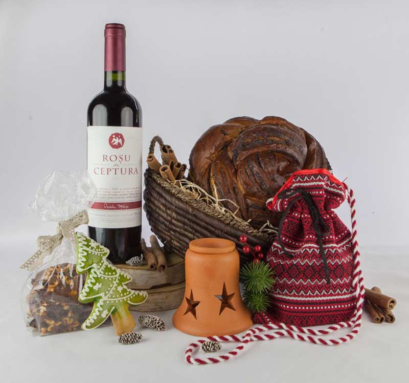 Cos cadou personalizat, cu produse traditionale in editie speciala de Craciun. Cosul contine: sticla vin rosu sec cupaj, editie speciala, Rosu de Ceptura 2014 Davino Dealu Mare (750ml), Cozonac traditional rotund cu crema de nuca si cacao (600g), Turta dulce glazurata artizanala bradut (45g), Ciocolata lapte cu stafide si alune de padure caramelizate Heidi (300g), Traistuta tesuta manual cu motive traditionale, Candela pentru aromaterapie, lucrata manual din ceramica. Produsele sunt atent selectate si sunt dispuse la interiorul unui cos impletiti din fibre naturale. Impachetat si decorat, acest produs va strani cu siguranta admiratia si aprecierea oricarei persoane. Acest cos cadou Craciun este alegerea potrivita pentru cadourile pe care le pregatesti angajatilor, clientilor sau colaboratorilor tai. Cosul cadou este ambalat suplimentar in folie decorata cu fundita asortata. Personalizarea acestui produs se poate realiza printr-un compliment card sau cu o banda din satin personalizata. Costurile de personalizare se calculeaza separat in functie de solicitarile clientului. Comanda minima: 50 buc.