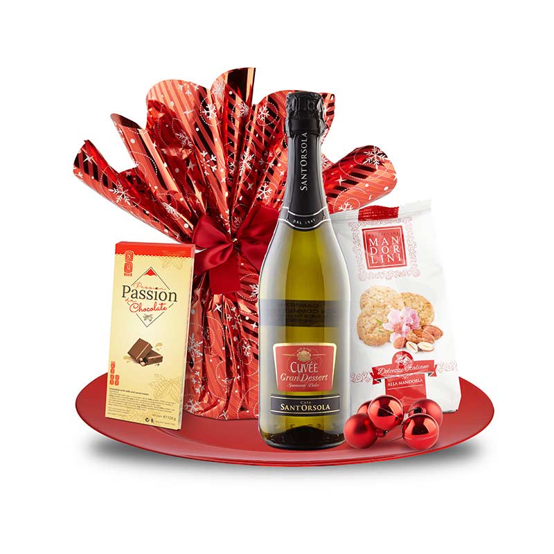 Cos cadou cu produse atent alese pentru masa de Craciun. Cosul contine o sticla de Spumant dulce Sant Orsola (75cl), Panettone cu stafide si coaja de portocala (500g), Tableta de ciocolata cu lapte Passion du Chocolate (100g), Fursecuri cu migdale Mandorlino Pozzi (100g), Decoratiune Glob. Produsele sunt dispuse pe un platou decorativ iar impreuna se transforma intr-un cadou complet care va fi cu siguranta apreciat. Acest cos cadou personalizat este potrivit pentru cadourile de Craciun pe care le pregatesti pentru angajati, colaboratori, clienti sau parteneri de afaceri. Recomandarea noastra de personalizare pentru acest produs este prin compliment card sau banda din satin personalizata. Costurile de personalizare se calculeaza separat in functie de specificatiile clientului. Comanda minima: 50 buc.