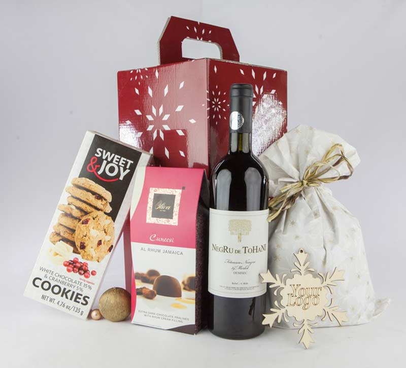 Cos cadou personalizat, cu produse potrivite pentru masa de Craciun. Cosul contine: sticla vin rosu demisec cupaj, editie speciala, Negru de Tohani (750ml), Panettone 100% unt cu stafide si coaja confiata de portocala, ambalat si decorat manual (500g), Praline din ciocolata neagra cu crema de rom Jamaica Cuneesi Oliva (95g), Fursecuri cu ciocolata alba si merisoare Sweet Joy (135g), Decoratiune din lemn de mesteacan (personalizabila). Toate aceste produse sunt dispuse la interiorul unei cutii pentru cadou decorata cu motive de Craciun. Cutia prezinta manere si completeaza aspectul festiv al cosului personalizat. Personalizarea acestui produs se poate realiza printr-un compliment card sau cu o banda din satin personalizata. Costurile de personalizare se calculeaza separat in functie de solicitarile clientului. Comanda minima: 50 buc.