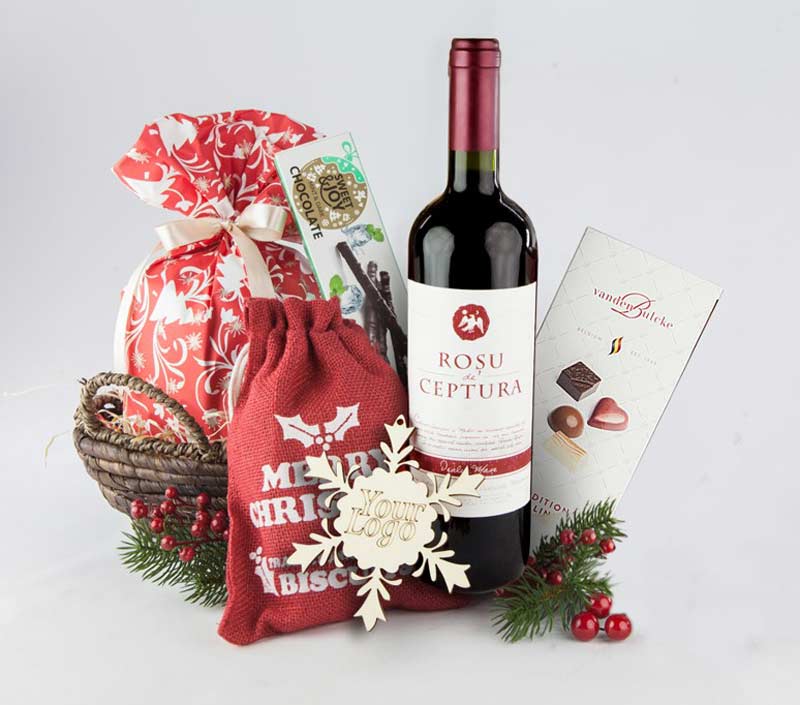 Cos cadou personalizat, cu produse atent selectionate pentru masa de Craciun. Cosul contine: sticla vin rosu sec cupaj, editie speciala, Rosu de Ceptura 2014 Davino Dealu Mare (750ml), Panettone 100% unt cu stafide si coaja confiata de portocala, ambalat si decorat manual (500g), Selectie de praline belgiene Confiserie Vandenbulcke (70g), Fursecuri traditionale englezesti cu portocala si bucati de ciocolata neagra Hessian Farmhouse (125g), Sticks din ciocolata neagra cu menta Sweet Joy (75g), Decoratiune din lemn de mesteacan (personalizabila). Toate produsele sunt ambalate cu atentie intr-un cos impletit cu manere iar impreuna formeaza un cadou aromat care va fi cu siguranta apreciat. Suplimentar cosul cadou este ambalat in folie si decorat cu fundita asortata. Acest cos cadou personalizat reprezinta un cadou unic si o alegere potrivita pentru cadourile pe care le pregatesti pentru angajatii, colaboratorii sau clientii tai. Personalizarea acestui produs se poate realiza printr-un compliment card sau cu o banda din satin personalizata. Costurile de personalizare se calculeaza separat in functie de solicitarile clientului. Comanda minima: 50 buc.