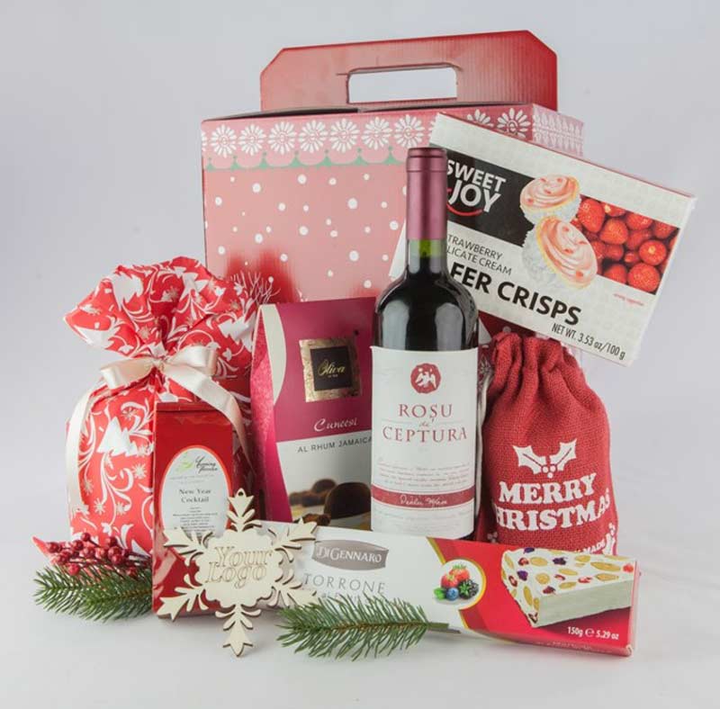Cos cadou personalizat, in editie speciala dedicata sarbatorilor de Craciun. Cosul contine: sticla vin rosu sec cupaj, editie speciala, Rosu de Ceptura 2014 Davino Dealu Mare (750ml), Panettone 100% unt cu stafide si coaja confiata de portocala, ambalat si decorat manual (500g), Praline din ciocolata neagra cu crema de rom Jamaica Cuneesi Oliva (95g), Ceai New Year Cocktail cu papaya, ananas, stafide, coaja de portocala, macese, hibiscus Morning Flavour (50g), Fursecuri traditionale englezesti cu portocala si bucati de ciocolata neagra Hessian Farmhouse (125g), Nougat cu miere, migdale si fructe de padure Di Gennaro (150g), Specialitate din napolitana crocanta cu crema de capsuni si fulgi de cocos Sweet Joy (100g), Decoratiune din lemn de mesteacan (personalizabila). Produsele sunt atent selectate si dispuse la interiorul unei cutii pentru cadouri decorata cu motive de Craciun. Aromele produselor dulci, completate de calitatea bauturii vor fi cu siguranta apreciate de orice persoana. Acest cos cadou personalizat reprezinta un cadou unic si o alegere potrivita pentru cadourile pe care le pregatesti pentru angajatii, colaboratorii sau clientii tai. Personalizarea acestui produs se poate realiza printr-un compliment card sau cu o banda din satin personalizata. Costurile de personalizare se calculeaza separat in functie de solicitarile clientului. Comanda minima: 50 buc.