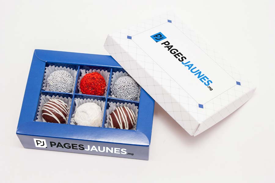 Cutie cu 6 praline belgiene fabricate si decorate manual. Bomboanele sunt asezate in cupe individuale din hartie si sunt dispuse la interiorul unei cutii din carton cu capac. Ciocolata personalizata folosita este de calitate superioara iar decorul deosebit va transforma aceasta cutie cu bomboane intr-un cadou unic. Acest produs este o varianta diferita de promovare a afacerii tale care va fi cu siguranta apreciata si remarcata. Poate fi folosita la evenimente, pentru cadouri corporate sau cadouri personalizate. Pentru decor sunt disponibile mai multe variante: nuca de cocos, nuci, cafea, fistic, zahar sau mix de fructe uscate. Dimensiuni cutie: 13.7 x 10.3 x 4.3 cm. Gramaj: 75g. Termen de valabilitate: 4 luni. Pretul include costurile pentru personalizarea produsului prin imprimare digitala. Comanda minima: 50 buc.