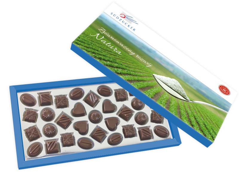 Cutie bomboane de ciocolata personalizata cu diverse forme si arome. Cutia este de dimensiuni mari si contine 33 de praline intr-o combinatie unica de 5 forme si 8 arome diferite. Bomboanele sunt dispuse pe un suport auriu sau argintiu iar umplutura acestora este foarte putin alcoolizata. Aromele disponibile sunt: sampanie, amaretto, nicu, menta, cafea, capsuni, vanilie si fudge. Este un produs dulce delicios care se poate transforma intr-un produs promotional de succes pentru evenimente, cadouri personalizate, cadouri corporate, campanii de promovare pentru produse sau pentru promovarea companiei tale. Dimensiuni cutie: 40 x 20.5 x 2.3 cm. Gramaj: 350g. Termen de valabilitate: 6 luni. Pretul include costurile pentru personalizarea produsului prin imprimare offset. Comanda minima: 100 buc.
