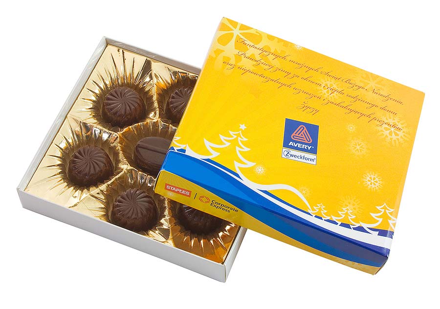 Cutie cu bomboane de ciocolata personalizata in editie speciala de Craciun. Contine 7 praline fabricate manual din ciocolata belgiana fie in varianta cu lapte fie in varianta clasica. Bomboanele sunt disponibile in 8 variante de arome (sampanie, amaretto, nuci, cafea, vanilie, menta, capsuni si fudge) si sunt dispuse pe un suport auriu sau argintiu la interiorul unei cutii personalizate cu inchidere cu capac. Acest produs aduce bucurie oricui datorita calitatii si rafinamentului ciocolatei si a varietatii aromelor. Utilizeaza acest produs in campaniile promotionale de Craciun, pentru cadouri corporate de Craciun sau pentru cadouri personalizate si cu siguranta nu vei da gres. Gramaj: 80g. Dimensiuni cutie: 13.5 x 12 x 2.5 cm. Termen de valabilitate: 6 luni. Pretul include personalizarea produsului prin imprimare offset. Comanda minima: 100 buc.