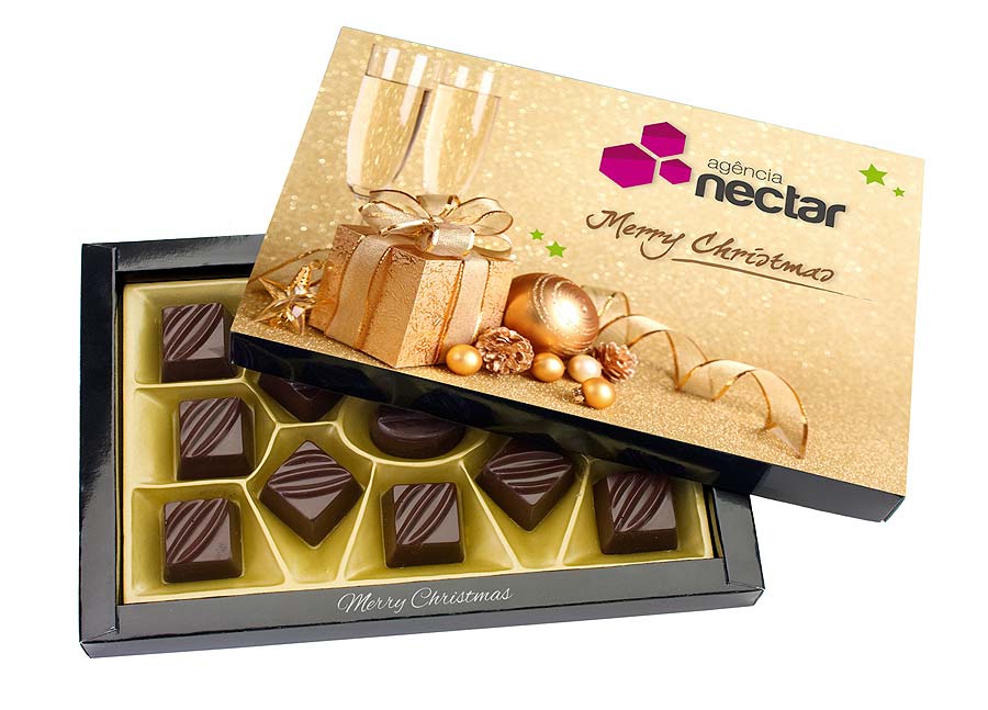 Cutie cu bomboane de ciocolata personalizata in editie speciala de Craciun. Contine 13 praline de ciocolata belgiana fie in varianta cu lapte fie in varianta clasica. Bomboanele sunt disponibile in 8 variante de arome (sampanie, amaretto, nuci, cafea, vanilie, menta, capsuni si fudge) si sunt dispuse pe un suport auriu sau argintiu la interiorul unei cutii personalizate cu inchidere cu capac. Acest produs aduce bucurie oricui datorita calitatii si rafinamentului ciocolatei si a varietatii aromelor. Utilizeaza acest produs in campaniile promotionale de Craciun, pentru cadouri corporate de Craciun sau pentru cadouri personalizate si cu siguranta nu vei da gres. Gramaj: 160g. Dimensiuni cutie: 22.7 x 14.9 x 18.8 cm. Termen de valabilitate: 6 luni. Pretul include personalizarea produsului prin imprimare digitala. Comanda minima: 100 buc.