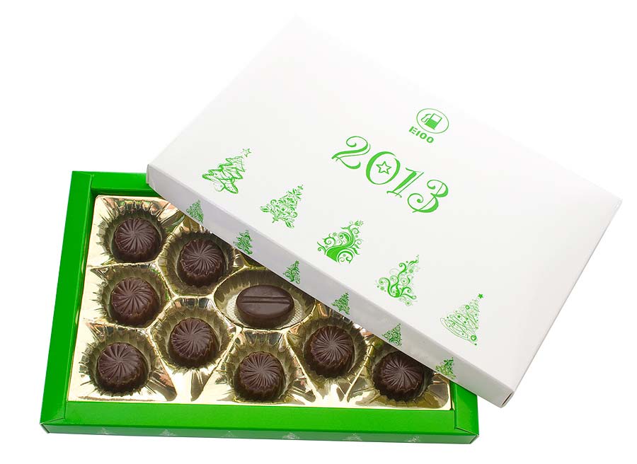 Cutie cu bomboane de ciocolata personalizata in editie speciala de Craciun. Contine 13 praline fabricate manual din ciocolata belgiana fie in varianta cu lapte fie in varianta clasica. Bomboanele sunt disponibile in 8 variante de arome (sampanie, amaretto, nuci, cafea, vanilie, menta, capsuni si fudge) si sunt dispuse pe un suport auriu sau argintiu la interiorul unei cutii personalizate cu inchidere cu capac. Acest produs aduce bucurie oricui datorita calitatii si rafinamentului ciocolatei si a varietatii aromelor. Utilizeaza acest produs in campaniile promotionale de Craciun, pentru cadouri corporate de Craciun sau pentru cadouri personalizate si cu siguranta nu vei da gres. Gramaj: 160g. Dimensiuni cutie: 22.7 x 14.9 x 18.8 cm. Termen de valabilitate: 6 luni. Pretul include personalizarea produsului prin imprimare digitala. Comanda minima: 100 buc.