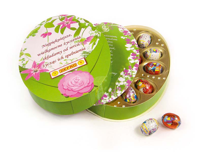 Cutie cu oua de ciocolata personalizata in editie dedicata sarbatorilor de Paste. Cutia este in forma de ou si contine 13 praline cu umplutura crocanta. Este un produs de calitate superioara care va face deliciul iubitorilor de ciocolata. Ouale de ciocolata sunt ambalate individual in folie metalizata cu motive pascale. Pralinele sunt dispuse la interiorul unei cutii cu capac si sunt acoperite cu o pelicula de hartie care poate fi folisita pentru imprimarea felicitarilor de sezon sau pentru mesaje publicitare suplimentare. Dimensiuni cutie: 22.9 x 16.7 x 3 cm. Gramaj: 140g. Termen de valabilitate: 6 luni. Pretul include costurile pentru personalizarea produsului prin imprimare offset. Comanda minima: 100 buc.