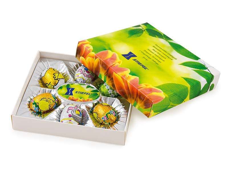 Cutie cu oua de ciocolata personalizata in editie dedicata sarbatorilor de Paste. Este un produs de calitate superioara care va face deliciul iubitorilor de ciocolata. Contine 6 oua de ciocolata ambalate individual in folie de aluminiu cu motive pascale. Pralinele sunt dispuse la interiorul unei cutii cu capac. Dimensiuni cutie: 12 x 13.3 x 2.4 cm. Gramaj: 62g. Termen de valabilitate: 3 luni. Pretul include costurile pentru personalizarea produsului prin imprimare offset. Comanda minima: 200 buc.