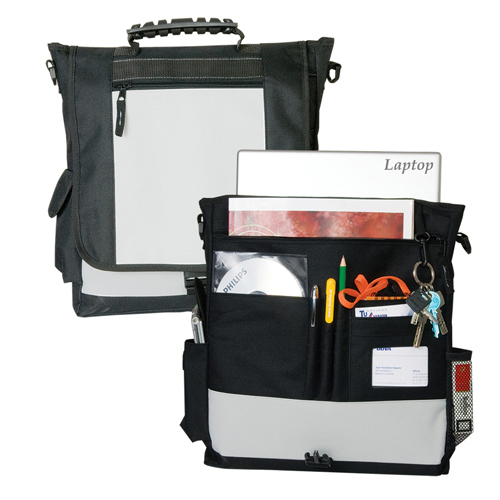 Geanta documente personalizata cu multiple compartimente: compartiment captusit pentru laptop, compartiment interior cu fermoar, buzunare pentru carduri/carti de vizita, suport pentru instrumente de scris, buzunare laterale, carabina interioara pentru chei, buzunar frontal cu fermoar. Inchiderea se realizeaza cu clapa prevazuta cu clema din plastic. Manerul este confectionat din material rezistent. Produs confectionat din poliester 600D. Culori: negru, negru/gri. Dimensiuni: 30 x 35 x 7 cm. Personalizarea acestui produs se poate realiza prin: serigrafie directa. Costurile de personalizare se calculeaza separat in functie de cerintele si specificatiile clientului. Comanda minima 50 buc. Pretul nu contine TVA.