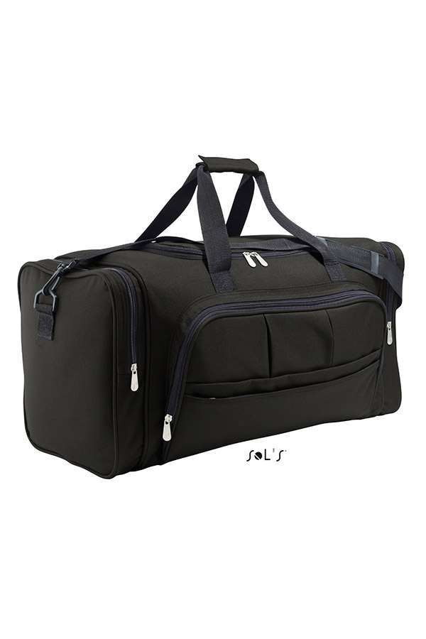 Geanta personalizata de voiaj formata dintr-un compartiment principal mare care se inchide cu fermoar dublu si circular, doua buzunare laterale cu fermoar si un compartiment frontal mare. Prezinta manere din nailon cu banda de protectie. Cureaua pentru umar este detasabila, reglabila, este realizata din nailon si prezinta banda de protectie. Fabricata din poliester 600D. Pentru personalizare geanta recomandam broderia sau serigrafia transferata. Costurile de imprimare se calculeaza in functie de siglele si/sau textele dorite. Marimi: Universala (26 x 62 x 30 cm). Culori disponibile: Negru, Rosu, Portocaliu, Bleumarin, Camuflaj. Comanda minima 50 buc. Pretul nu contine TVA.