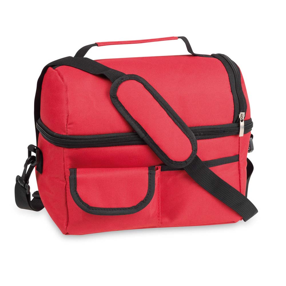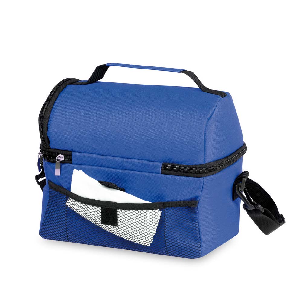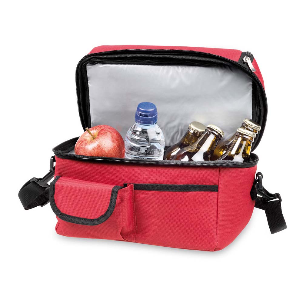Geanta termoizonalta personalizata prevazuta cu buzunare multiple. Este un produs cu spatiu de depozitare generos si design atractiv. Compartimentul principal se inchide cu fermoar, prezinta doua buzunare frontale si un buzunar din plasa pe partea din spate. Unul dintre buzunarele frontale si cel din plasa se inchide cu scai. Geanta termoizolanta prezinta maner intarit si bretea de umar reglabila si detasabila. Breteauta de umar este prevazuta cu banda de protectie pentru un confort sporit. Este un produs util in calatorii, concedii, drumetii sau iesiri ocazionale in natura. Perzonalizeaza aceasta geanta si vei avea parte de un obiect promotional deosebit. Produs confectionat din poliester 600D si PVC. Culori: albastru, negru, rosu. Dimensiuni: 25 x 24 x 15 cm. Va recomandam personalizare geanta prin serigrafie directa sau transferata. Costurile de personalizare se calculeaza separat in functie de siglele sau textele solicitate. Comanda minima 50 buc.