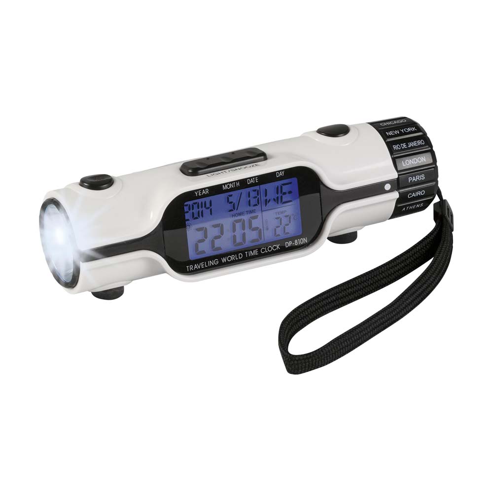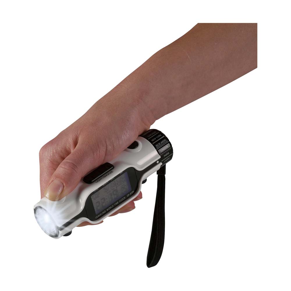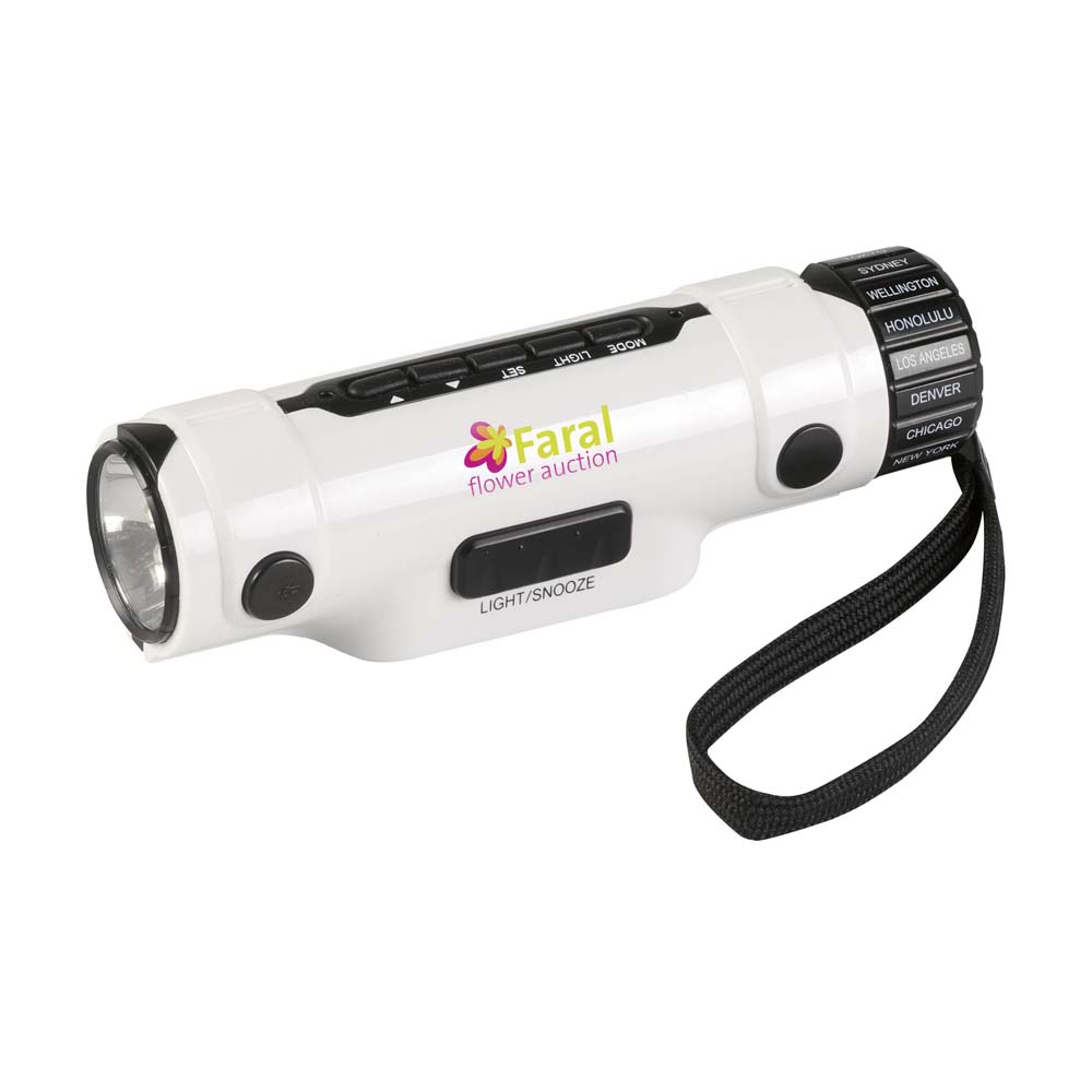 Lanterna personalizata multifunctionala prevazuta cu display digital cu lumina de fundal albastra. Este prevazuta cu 3 becuri LED puternice si cu multiple functii afisate pe ecranul digital: ceas, alarma, cronometru, calendar (data si ziua calendaristica), termometru (grade celsius si fahrenheit) si afisaj ora pe glob pentru 18 orase importante ale lumii. Este un produs multifunctional cu design compact prevazut cu curea pentru incheietura mainii. Se livreaza ambalata in cutie impreuna cu instructiuni de utilizare si cu baterii incluse in pret. Dimensiuni: 13.2 x 4 x 3.8 cm. Va recomandam personalizare lanterna prin tampografie. Costurile de personalizare se calculeaza separat in functie de detaliile tehnice ale proiectului dvs. Comanda minima 50 buc.
