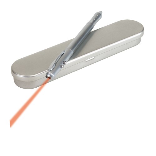 Laser pointer personalizat din metal cu pix incorporat. Pasta pixului este de culoare neagra si este prevazut cu o lumina LED de culoare alba. Se livreaza cu baterii incluse in pret si ambalat in cutie din aluminiu. Produs confectionat din alama. Dimensiuni: diametru 1 x 15 cm. Pentru personalizarea produsului recomandam gravura laser sau tampografia. Costurile de personalizare se calculeaza separat in functie de siglele si textele dorite. Comanda minima 50 buc. Pretul nu contine TVA.