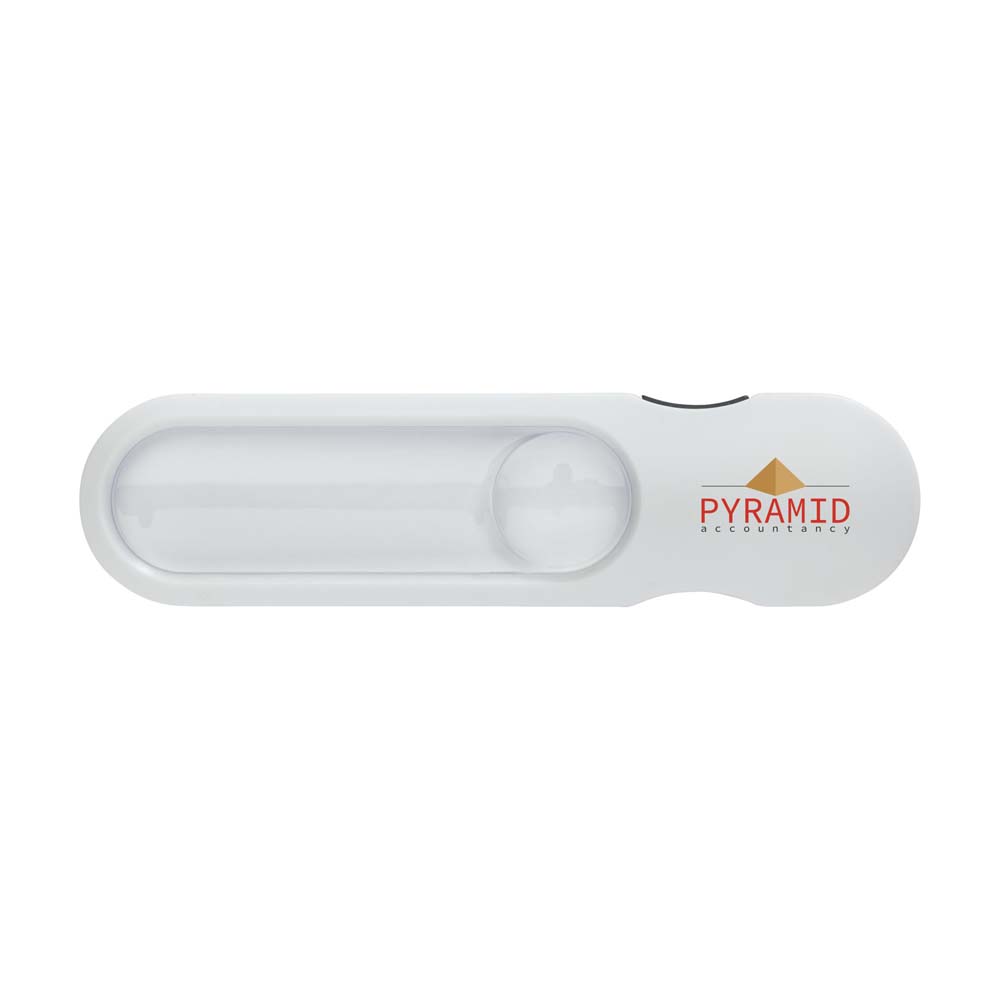 Lupa personalizata prevazuta cu lumina LED de culoare alba. Este prevazuta cu doi factori de marire 2 si 3. Prezinta maner pentru usurinta in manevrare. Se livreaza cu baterii incluse in pret. Culori: negru, alb. Dimensiuni: 13.8 x 3.5 x 1.1 cm. Va recomandam personalizare lupa prin tampografie. Costurile de personalizare se calculeaza separat in functie de detaliile tehnice ale proiectului dvs. Comanda minima 100 buc.