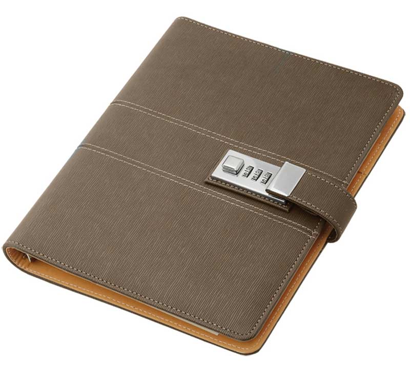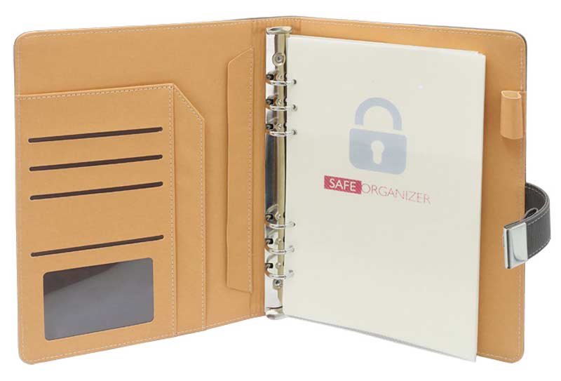 Organizer personalizat, format A5, coperta confectionata din piele ecologica cu aspect texturat. Se inchide cu clapa securizata cu cifru. La interior cuprinde: 2 compartimente pentru documente, 3 buzunare pentru carduri, buzunar transparent, suport pentru instrument de scris si sina metalica pentru fixarea hartiei. Este prevazut cu calendar si hartie format A5. Este un produs modern foarte util in munca de birou care se poate transforma intr-un obiect promotional de succes pentru compania, serviciile sau produsele tale. Produs confectionat din piele ecologica si hartie. Culori: gri, maro. Dimensiuni: 19 x 23.5 x 3 cm. Va recomandam personalizare organizer prin embosare. Costurile de personalizare se calculeaza separat in functie de siglele si textele dorite. Comanda minima 50 buc.
