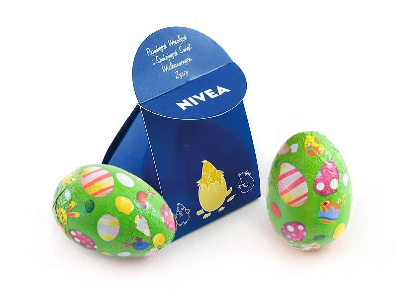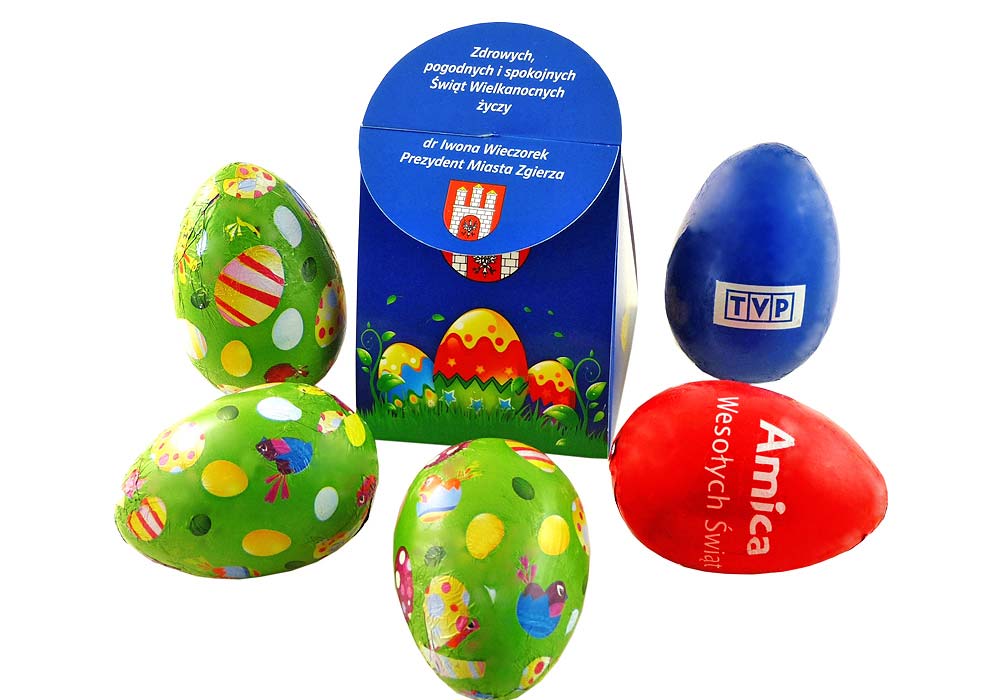 Ou de ciocolata personalizata in marime naturala potrivit pentru sarbatorile de Paste. Este un produs de calitate superioara fabricat din ciocolata belgiana, care va face deliciul oricarui iubitor de ciocolata. Oul este invelit in folie de aluminiu cu motive de primavara si este ambalat intr-o cutie din carton cu design modern. Dimensiuni ou: 6.8 x 4.7 cm. Dimensiuni cutie: 6.8 x 6.8 x 8 cm. Gramaj: 30g. Termen de valabilitate: 6 luni. Pretul include costurile pentru personalizarea produsului prin flexografie. Comanda minima: 200 buc.