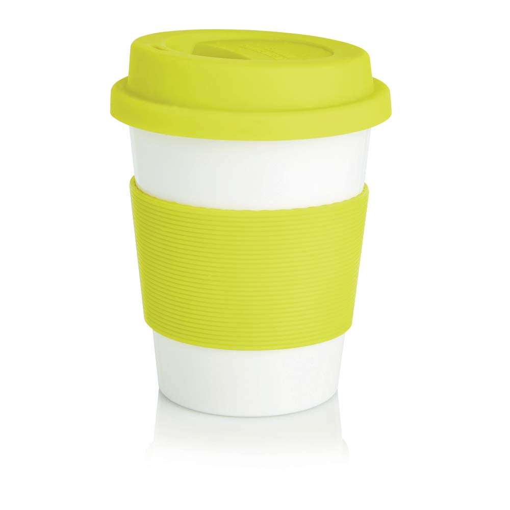Pahar personalizat ideal pentru consumul de cafea. Are o capacitate de 350ml si este confectionat din materiale 100% biodegradabile. Capacul paharului persinalizat si banda din zona de prindere sunt confectionate din silicon colorat. Este un produs foarte util pentru consumul de cafea sau ceai in masina, este ergonomic si poate fi introdus in cuptorul cu microunde (120 de grade) sau spalat la masina. Produs PBA free. Culori: gri/alb, rosu/alb, albastru/alb, verde deschis/alb, , verde/alb, portocaliu/alb, roz/alb. Dimensiuni: diametru 9.5 x 12.3 cm. Pentru personalizare pahar va recomandam tampografia. Costurile de personalizare se calculeaza separat in functie de siglele/textele dorite. Comanda minima 50 buc.