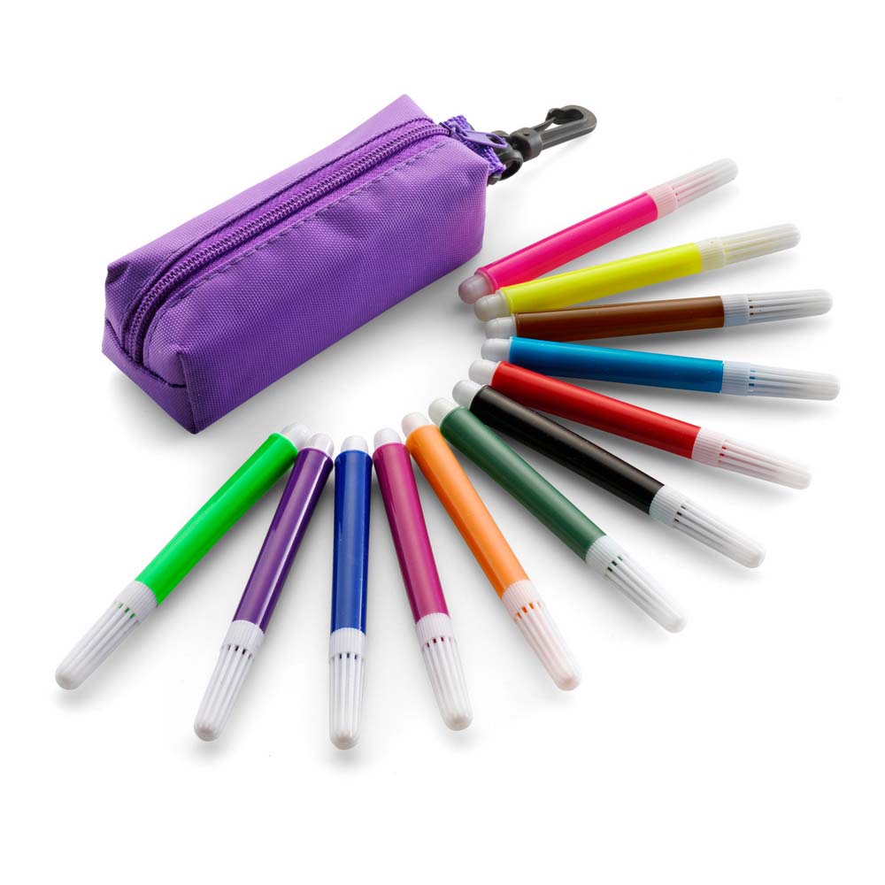Penar personalizat echipat cu 12 carioci colorate de dimensiuni mici. Se inchide cu fermoar si este prevazut cu o carabina din plastic pentru atasarea la geanta sau rucsac. Potrivit pentru utilizarea la gradinita, la scoala sau acasa acest produs il va ajuta pe cel mic sa isi descopere si sa isi dezvolte abilitatile artistice. Este potrivit pentru personalizarea si utilizarea in cadrul evenimentelor pentru copii sau ca material promotional in campaniile de promovare dedicate copiilor. Produs confectionat din plastic si poliester 70D. Culori: mov, verde, albastru, rosu. Dimensiuni: 10 x 3.8 x 3.2 cm. Va recomandam personalizare penar prin tampografie, serigrafie directa sau transferata, print UV. Costurile de personalizare se calculeaza separat in functie de specificatiile proiectului dvs. Comanda minima 100 buc.