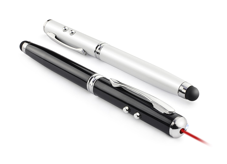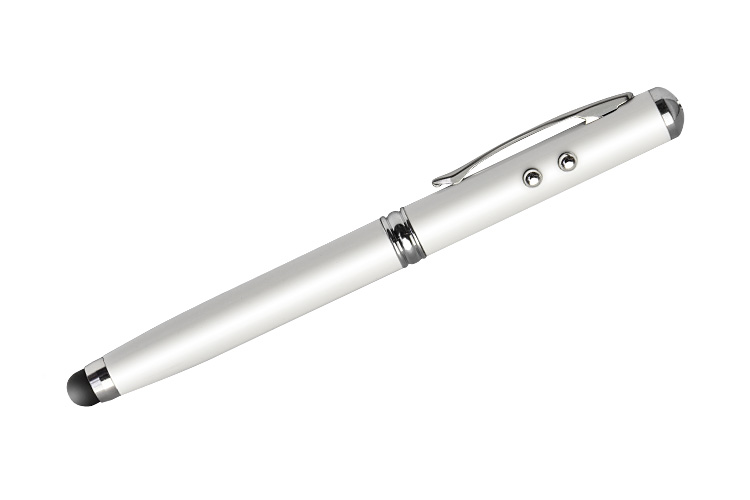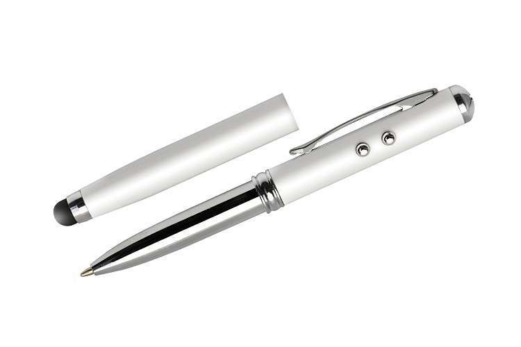Pix metalic imprimat multifunctional cu capac. Acest pix indeplineste patru functii: instrument de scris, touch pen, indicator laser si lanterna. Capacul pixului este prevazut cu un cauciuc special creat pentru actionarea gadget-urilor cu touch screen care va va fi foarte util deoarece nu zgaraie suprafata, nu lasa amprente/urme, este foarte precis si poate fi utilizat in orice situatie (ex: conditii meteo nefavorabile). Pentru utilizarea ca lanterna sau indicator laser, produsul prezinta doua butoane special create pentru activarea acestor functii. Pasta pixului este de culoare albastra. Culori: Alb, Negru, Albastru, Rosu. Dimensiuni: 124 x 10 mm. Produsul se poate personaliza prin tampografie metal, gravura sau print UV. Costul personalizarii se calculeaza in functie de specificatiile clientului. Comanda minima 50 buc. Pretul nu contine TVA.