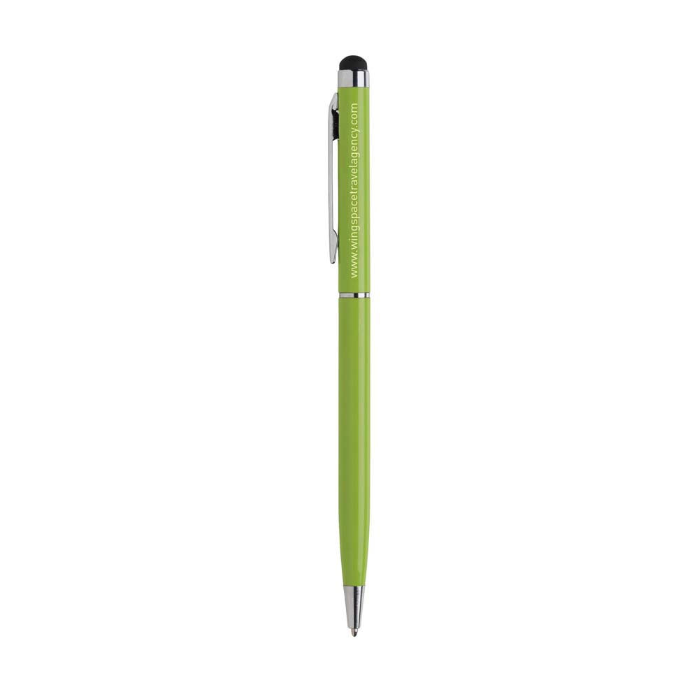 Pix metalic personalizat cu corp colorat, design subtire si functie touch pen. In partea superioara, pixul este prevazut cu un buton cauciucat de culoare neagra pe care il poti folosi la manevrarea cu precizie a ecranelor tactile. Pixul are un finisaj exterior lucios si este prevazut cu clips metalic si componente argintii care dau un plus de eleganta produsului. Pasta acestui pix personalizat este de culoare albastra iar mecanismul de actionare este prin rasucire. Pixurile metalice personalizate sunt un accesoriu nelipsit si foarte util in munca de birou. Alege sa personalizezi acest pix si sa il incluzi pe lista materialelor promotionale ale companiei tale si vei avea un obiect promotional foarte apreciat care poate fi utilizat si pentru cadouri corporate personalizate. Culori: argintiu, alb, bleumarin, verde, negru, rosu, mov. Va recomandam personalizare pix metalic prin gravare laser. Costurile de personalizare se calculeaza separat in functie de detaliile tehnice ale proiectului dvs. Comanda minima 100 buc.
