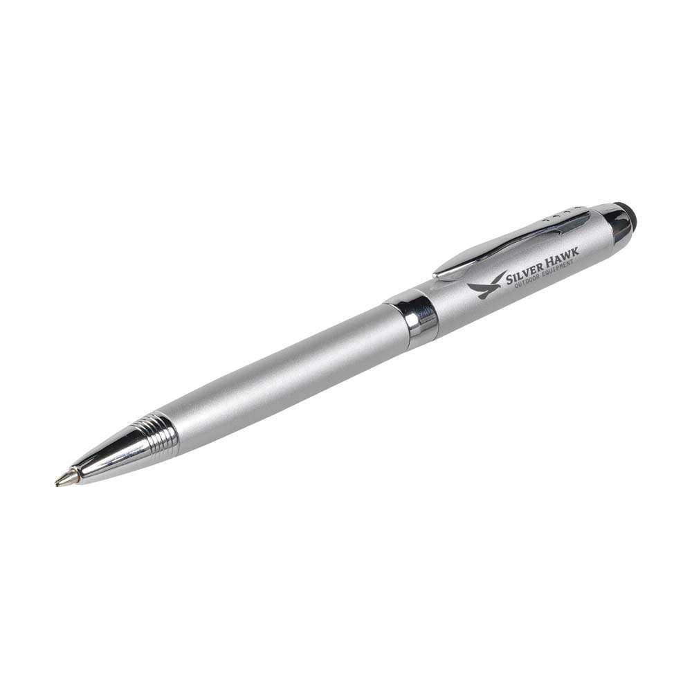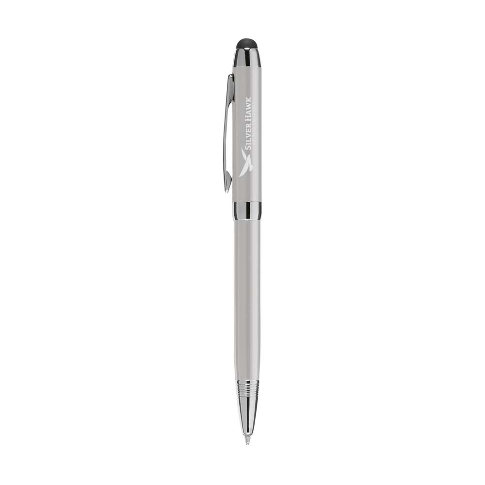 Pix metalic personalizat cu design elegant si prevazut cu functie touch pen. In partea superioara, pixul este prevazut cu un buton cauciucat de culoare neagra pe care il poti folosi la manevrarea cu precizie a ecranelor tactile. Pixul are un finisaj exterior lucios si este prevazut cu clips metalic si componente argintii care dau un plus de eleganta produsului. Pasta acestui pix personalizat este de culoare albastra iar mecanismul de actionare este prin apasare. Pixurile metalice personalizate sunt un accesoriu nelipsit si foarte util in munca de birou. Alege sa personalizezi acest pix si sa il incluzi pe lista materialelor promotionale ale companiei tale si vei avea un obiect promotional foarte apreciat care poate fi utilizat si pentru cadouri corporate personalizate. Culori: argintiu, negru. Va recomandam personalizare pix metalic prin tampografie. Costurile de personalizare se calculeaza separat in functie de detaliile tehnice ale proiectului dvs. Comanda minima 50 buc.