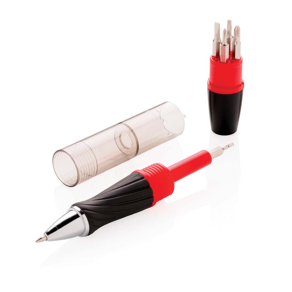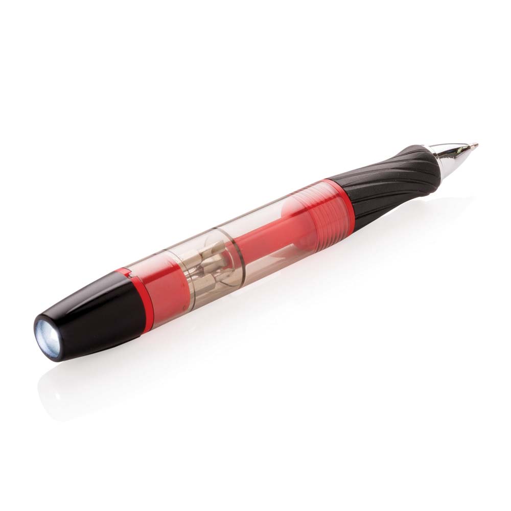Pix personalizat multifunctional cu design ergonomic. Acest produs combina cu succes trei functii: lanterna, instrument de scris si surubelnita cu 5 capete diferite. Lanterna si instrumentul de scris se actioneaza prin rasucire. Cele 5 capete de surubelnita sunt fixate intr-un suport special in interiorul corpului pixului. Este un produs multifunctional foarte util care combina cu succes trei obiecte de uz general cu utilizare frecventa. Produs confectionat din ABS si AS. Dimensiuni: 1.8 x 1.8 x 15 cm. Pentru personalizare produs va recomandam tampografia. Costurile de personalizare se calculeaza separat in functie de specificatiile proiectului dvs. Comanda minima 50 buc.