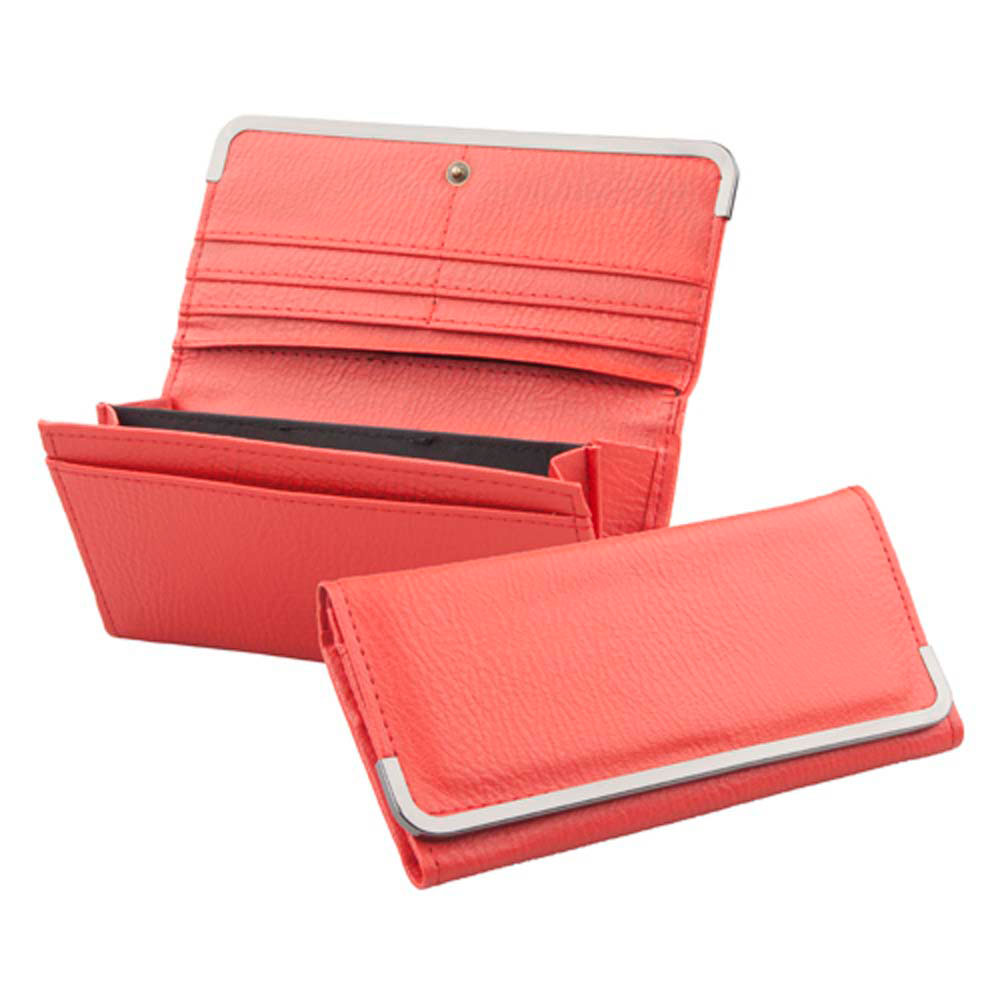 Portofel personalizat pentru femei confectionat din imitatie de piele. Design elegant prevazut cu multiple compartimente la interior, inchidere cu capsa metalica si clapa prevazuta cu margine metalica. Culori: rosu, negru. Dimensiuni: 18.5 x 9 x 2.5 cm. Personalizarea acestui produs se poate realiza prin timbru sec, folio sau print UV. Costurile serviciului de personalizare se calculeaza separat in functie de detaliile tehnice ale proiectului dvs. Comanda minima 50 buc.