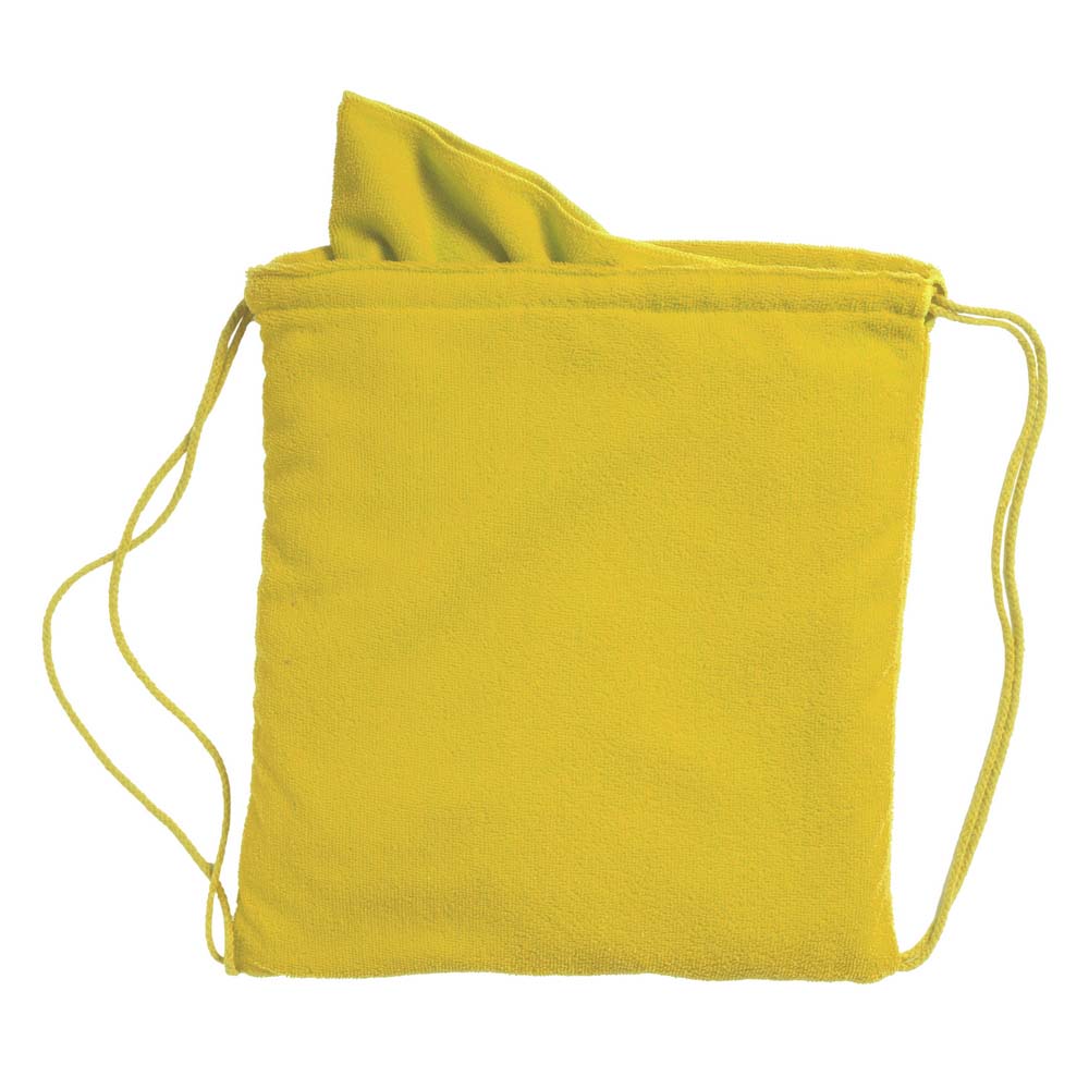 Prosop plaja personalizat prevazut cu husa de tip rucsac cu snur. Este un prosop personalizat cu capacitate de absorbtie ridicata potrivit pentru utilizarea la plaja. Este un produs potrivit pentru utilizarea in campaniile de promovare organizate in perioada estivala. Fiind un produs foarte utilizat in perioada verii prin personalizare prosop vei avea parte de un material de promovare de succes pentru compania sau produsul tau. Husa speciala in care se depoziteaza acest prosop faciliteaza transportul individual a acestui prosop personalizat. Produs confectionat din microfibra (160 g/m2). Culori: rosu, verde, albastru, galben, portocaliu. Dimensiuni desfacut: 70 x 150 cm. Dimensiuni pliat: diametru 37 x 37 cm. Va recomandam personalizarea prin serigrafie. Costurile de personalizare se calculeaza separat in functie de specificatiile proiectului dvs. Comanda minima 50 buc.