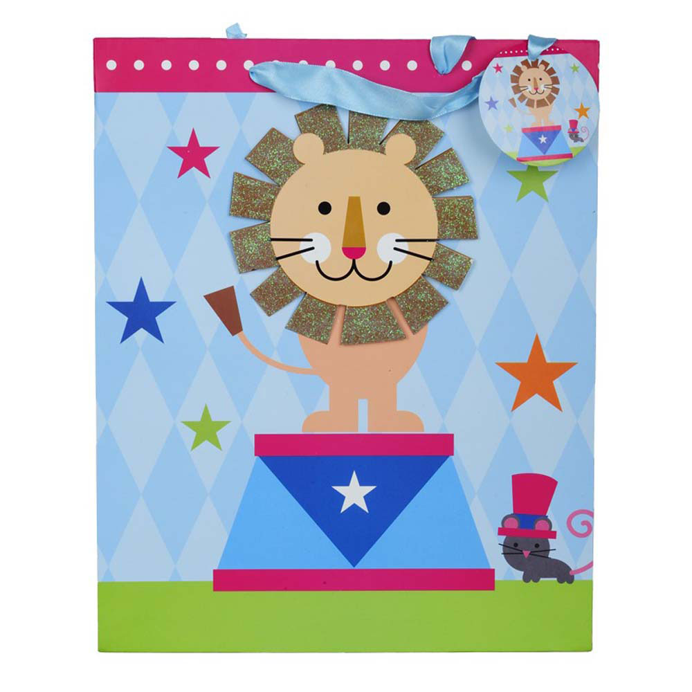 Punga imprimata pentru cadouri potrivita pentru copii. Design cu animale prevazut cu un leu 3D pe partea frontala. Este prevazuta cu manere din satin si mini felicitare asortata. Produs confectionat din hartie (210 g/m2). Dimensiuni: 26 x 32 x 12 cm. Va recomandam personalizarea prin serigrafie directa sau productie speciala. Costurile de personalizare se calculeaza separat in functie de specificatiile si detaliile tehnice ale proiectului care se doreste sa se realizeze. Comanda minima 100 buc.