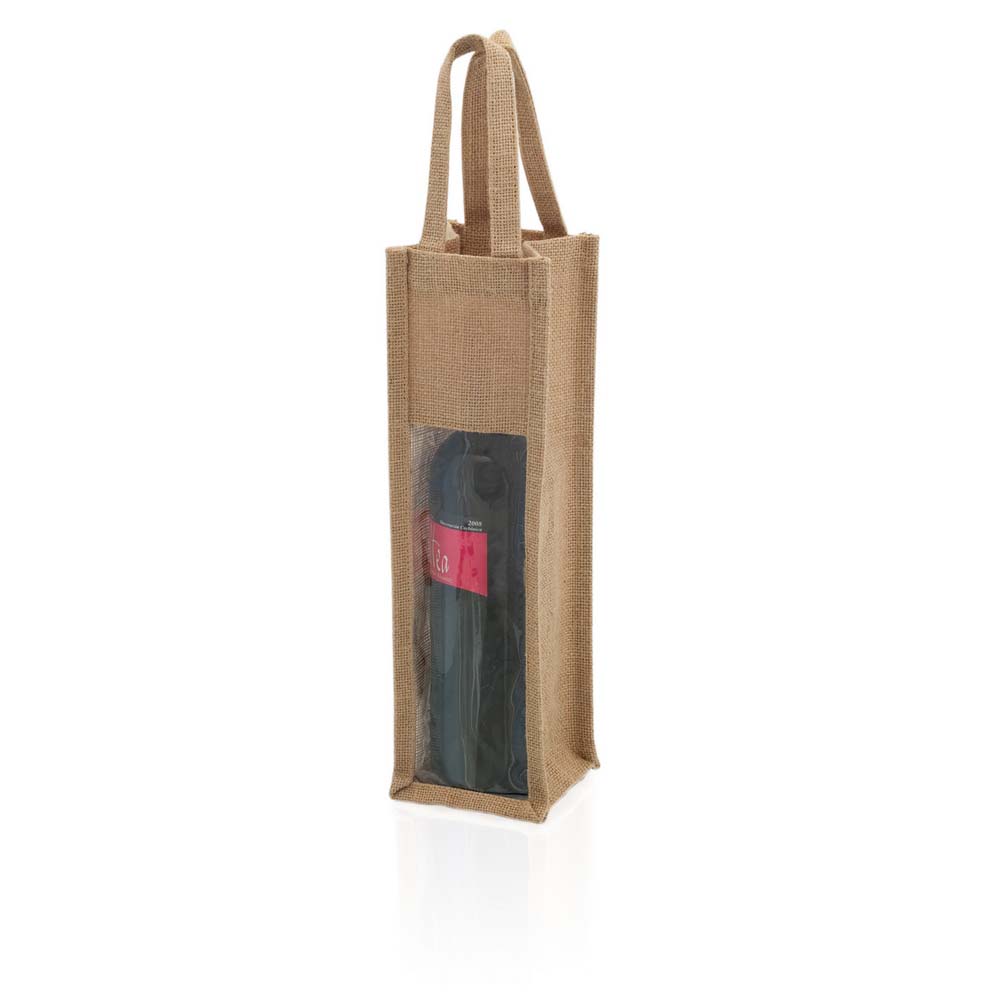 Punga cadou personalizata confectionata din iuta. Este un produs elegant potrivit pentru ambalarea unei sticle de vin. Este prevazuta cu manere si fereastra frontala. Potrivita pentru cadouri corporate personalizate sau pentru campaniile de promovare de produse, aceasta punga cadou personalizata se poate utiliza si pentru realizarea cosurilor cadou sau a cadourilor deosebite daruite cu oacazia sarbatorilor de iarna sau de Paste. Produs confectionat din iuta. Dimensiuni: 10.5 x 35.5 x 10 cm. Va recomandam personalizarea prin tampografie sau gravura pe produse sau cutie. Costurile de personalizare se calculeaza separat in functie de specificatiile proiectului dvs. Comanda minima 50 buc.