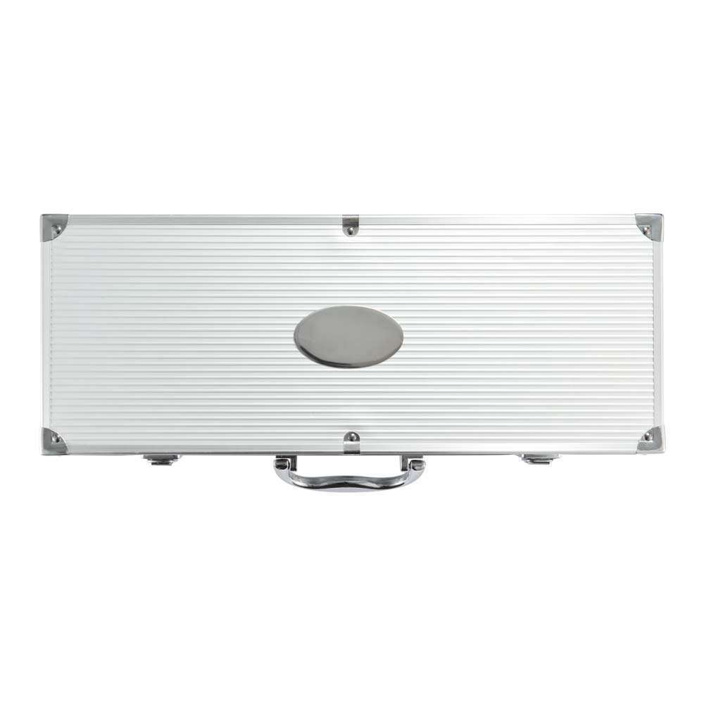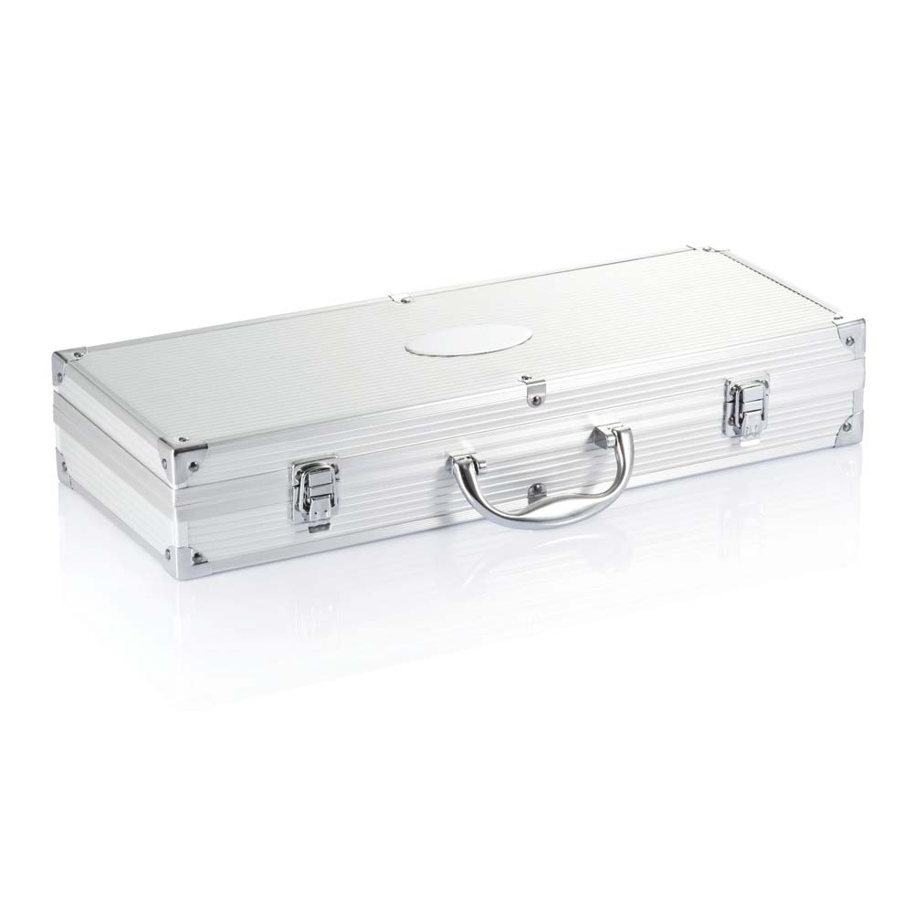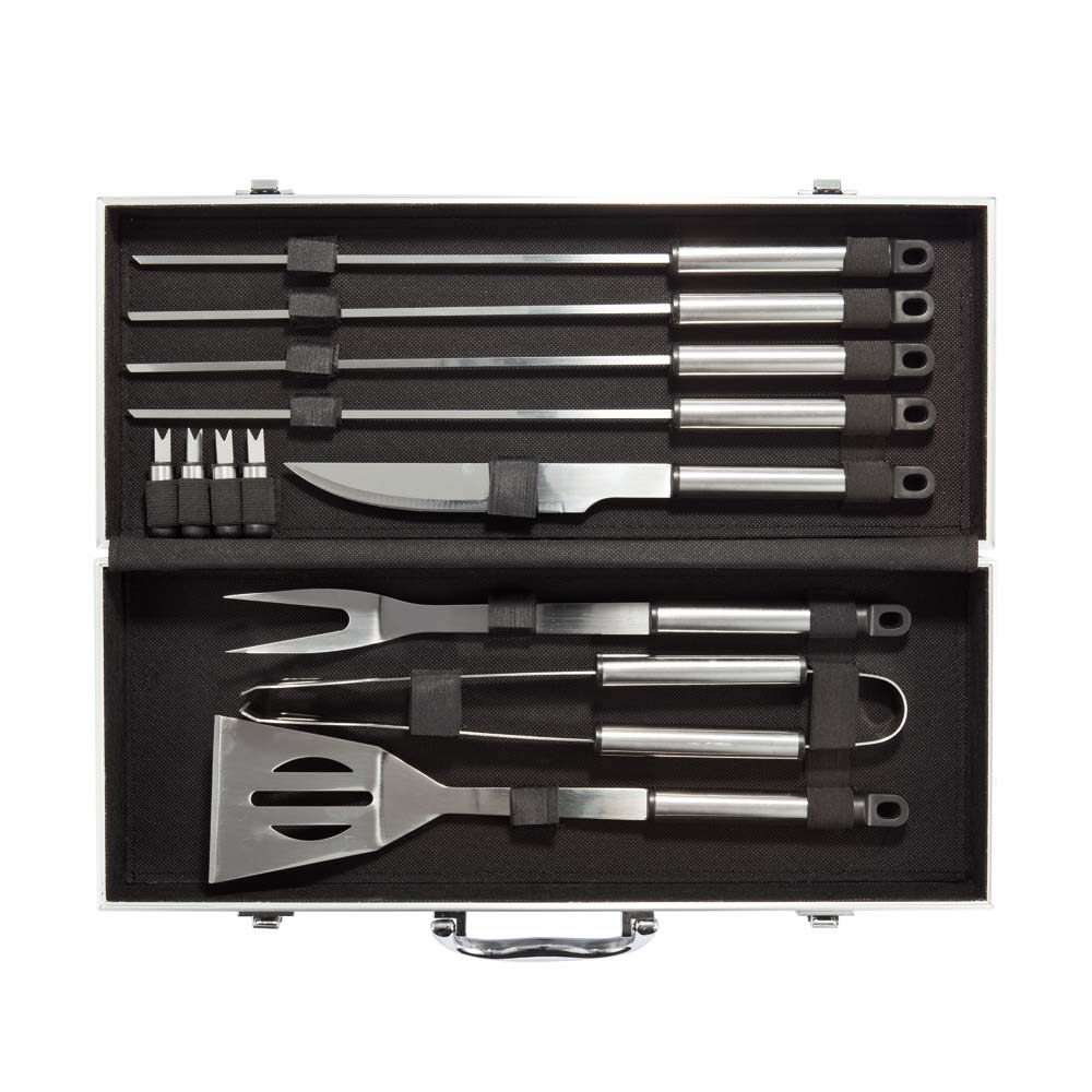 Set accesorii pentru gratar personalizate dispuse in cutie metalica cu design modern. Setul cuprinde 12 accesorii necesare pentru un gratar perfect: 4 frigarui, cutit, spatula, furculita gratar, 4 suporturi pentru porumb si cleste. Cele 12 piese sunt dispuse la interiorul uneii cutii metalice prevazuta cu maner si incuietori metalice. Accesoriile sunt foarte rezistente in timp, sunt usor de curatat si sunt foarte practice. Acest set personalizat contine toate accesoriile necesare pentru pregatirea unui gratar in gradina sau la iarba verde. Produs confectionat din otel inoxidabil si aluminiu. Dimensiuni: 46 x 17 x 7 cm. Pentru personalizare produs va recomandam gravarea laser. Costurile de personalizare se calculeaza separat in functie de specificatiile proiectului dvs. Comanda minima 50 buc.