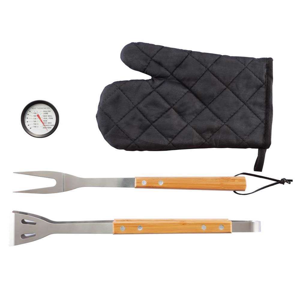 Set accesorii pentru gratar personalizate cu design modern. Setul cuprinde 4 accesorii necesare pentru un gratar perfect: spatula si cleste, ambele cu maner de lemn, manusa si termometru pentru carne. Accesoriile sunt foarte rezistente in timp, sunt usor de curatat si sunt foarte practice. Acest set personalizat contine toate accesoriile necesare pentru pregatirea unui gratar in gradina sau la iarba verde. Produs confectionat din otel inoxidabil si lemn de bambus. Dimensiuni: 42 x 26.5 x 6 cm. Pentru personalizare produs va recomandam tampografia. Costurile de personalizare se calculeaza separat in functie de specificatiile proiectului dvs. Comanda minima 50 buc.