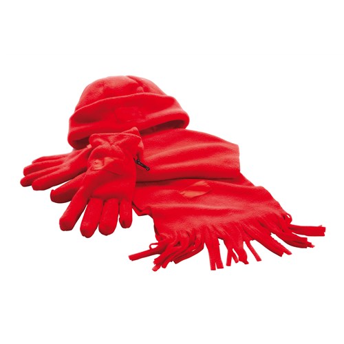 Set unisex accesorii de iarna imprimate compus din: caciula, fular cu franjuri, manusi cu sistem de prindere intre ele din plastic. Produsele sunt confectionate din fleece si prezinta eticheta imprimabila. Fabricat 100% din poliester. Culori: albastru, negru, rosu. Marime universala. Se recomanda personalizarea produsului prin termotransfer. Costurile de personalizare se calculeaza separat in functie de specificatiile proiectului dvs. Comanda minima 50 buc. Pretul nu contine TVA.