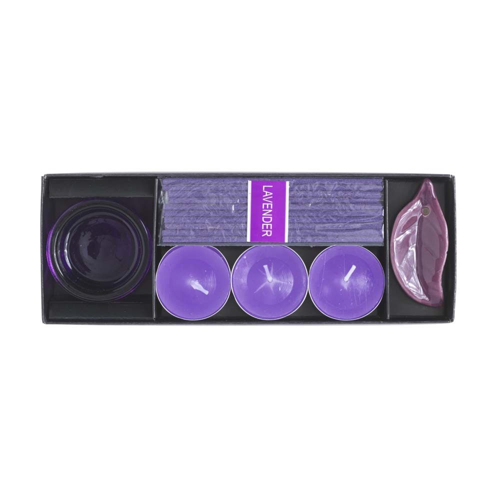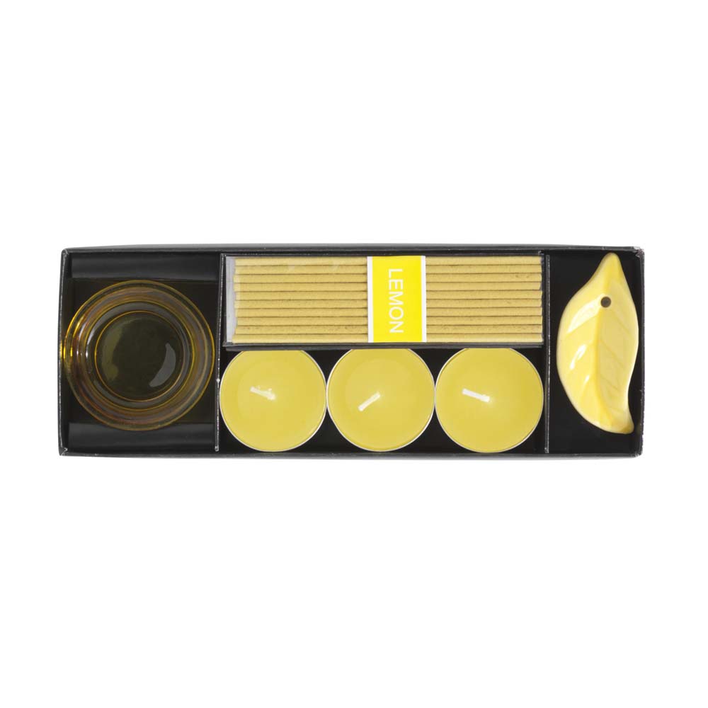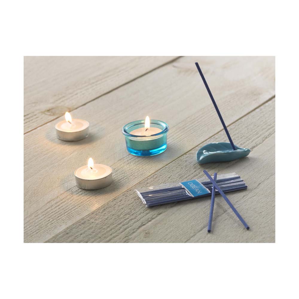 Set aromoterapie personalizat compus din: 10 betisoare parfumate, suport ceramic cu design in forma de frunza pentru arderea betisoarelor parfumate, 3 lumari parfumate si un suport transparent pentru folosirea in siguranta a lumanarilor. Este un produs modern care se poate transforma intr-un cadou personalizat eosebit. Se livreaza ambalat in cutie. Culori/arome: albastru/ocean, mov/lavanda, portocaliu/portocaliu, galben/lamaie. Dimensiuni: 20.5 x 7.3 x 3 cm. Va recomandam personalizarea produsului prin sticker personalizat. Costurile de personalizare se calculeaza separat in functie de detaliile tehnice ale proiectului dvs. Comanda minima 50 buc.