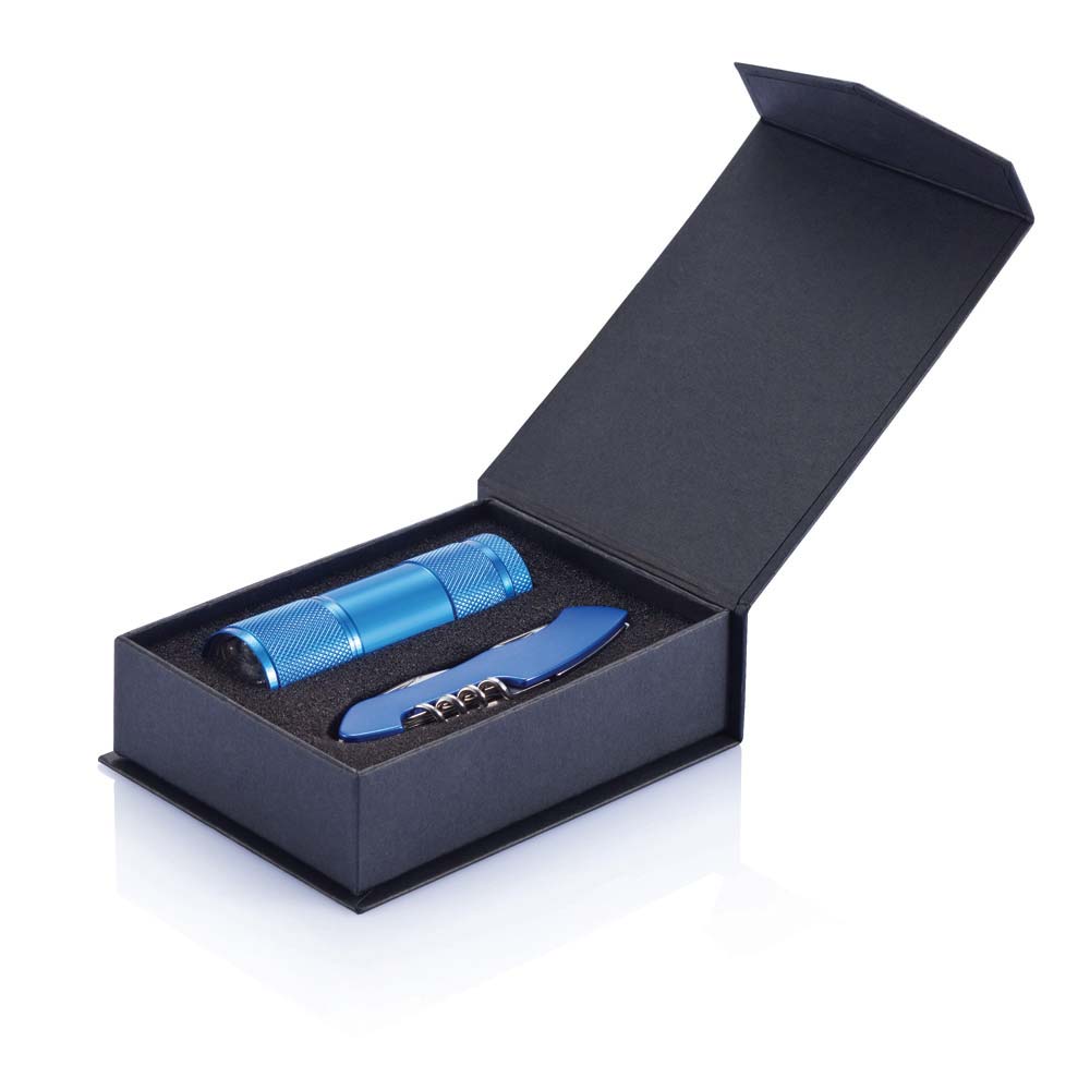 Set personalizat compus din cutit de buzunar si lanterna personalizata. Briceagul personalizat este prevazut cu 13 functii iar carcasa acestuia este confectionata din aluminiu cu finisaj mat (functii: lama mare, lama zimtata, foarfece, desfacator conserve, tirbuson, pila, surubelnita, sula, etc.). Lanterna este prevazuta cu becuri LED si curea pentru agatare/atarnare, este confectionata din aluminiu si se livreaza cu baterii incluse in pret. Setul personalizat se livreaza ambalat in cutie cadou de culoare neagra. Produs confectionat din otel inoxidabil si aluminiu. Culori: argintiu, verde, albastru. Dimensiuni: 12.5 x 9.5 x 3.5 cm. Pentru personalizare produs va recomandam gravarea laser. Costurile de personalizare se calculeaza separat in functie de cerintele clientului. Comanda minima 50 buc.