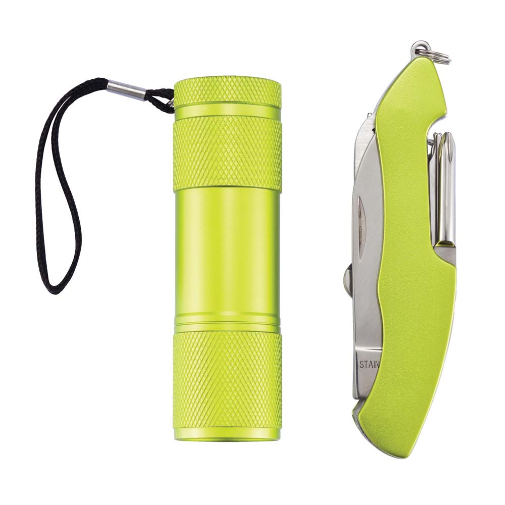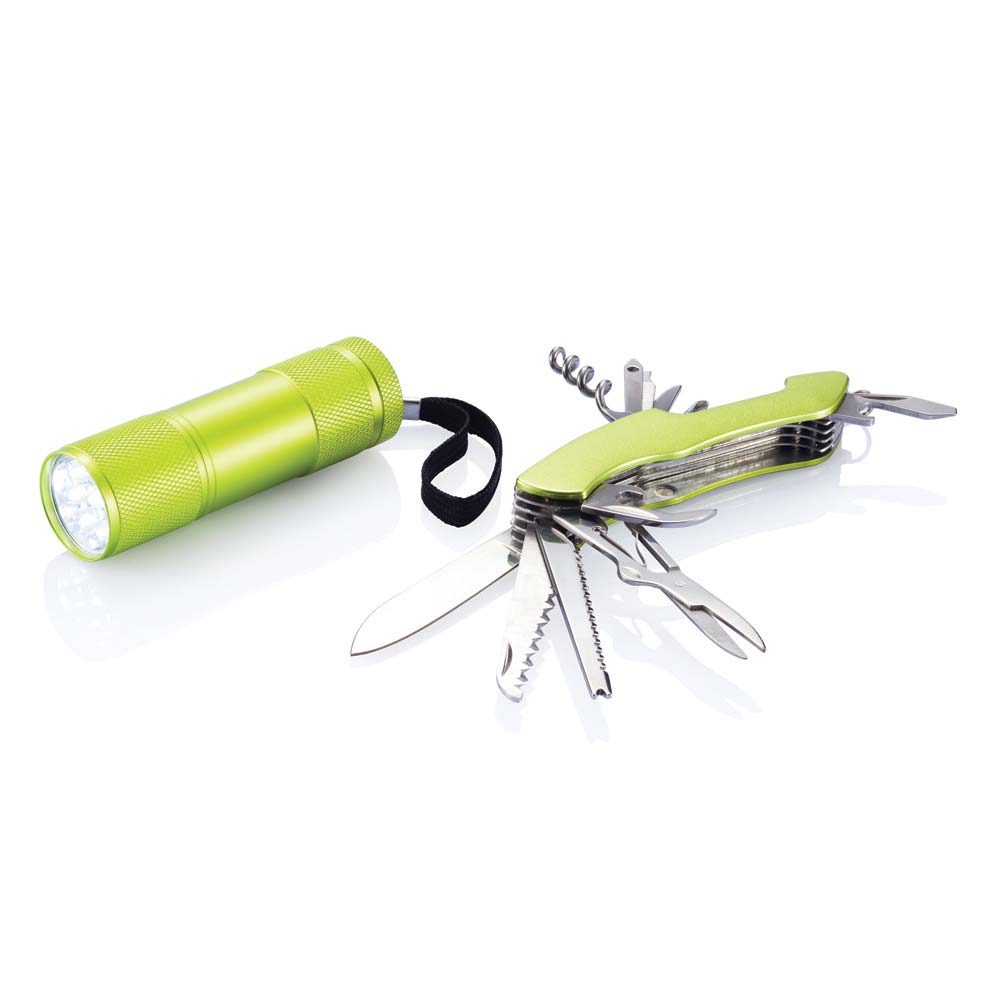 Set personalizat compus din cutit de buzunar si lanterna personalizata. Briceagul personalizat este prevazut cu 13 functii iar carcasa acestuia este confectionata din aluminiu cu finisaj mat (functii: lama mare, lama zimtata, foarfece, desfacator conserve, tirbuson, pila, surubelnita, sula, etc.). Lanterna este prevazuta cu becuri LED si curea pentru agatare/atarnare, este confectionata din aluminiu si se livreaza cu baterii incluse in pret. Setul personalizat se livreaza ambalat in cutie cadou de culoare neagra. Produs confectionat din otel inoxidabil si aluminiu. Culori: argintiu, verde, albastru. Dimensiuni: 12.5 x 9.5 x 3.5 cm. Pentru personalizare produs va recomandam gravarea laser. Costurile de personalizare se calculeaza separat in functie de cerintele clientului. Comanda minima 50 buc.